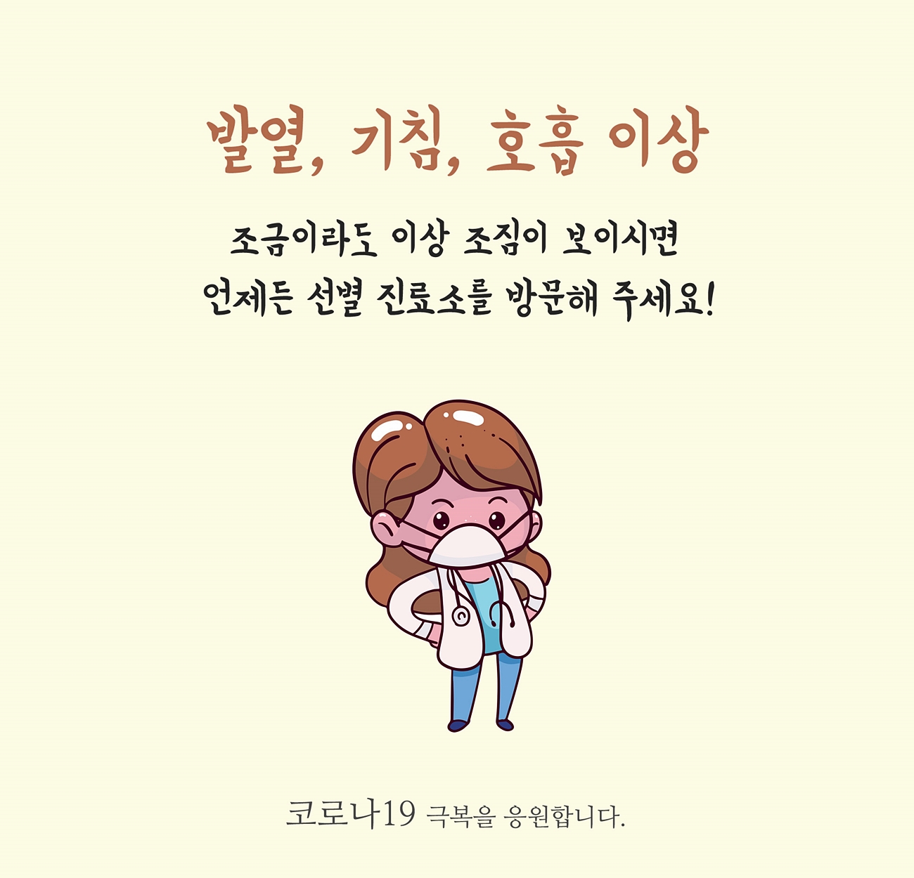 발열이나 기침, 호흡 이상 등의 조금이라도 이상 조짐이 보이게 되면 언제든 선별 진료소를 방문해달라는 문구를 적어봤습니다.