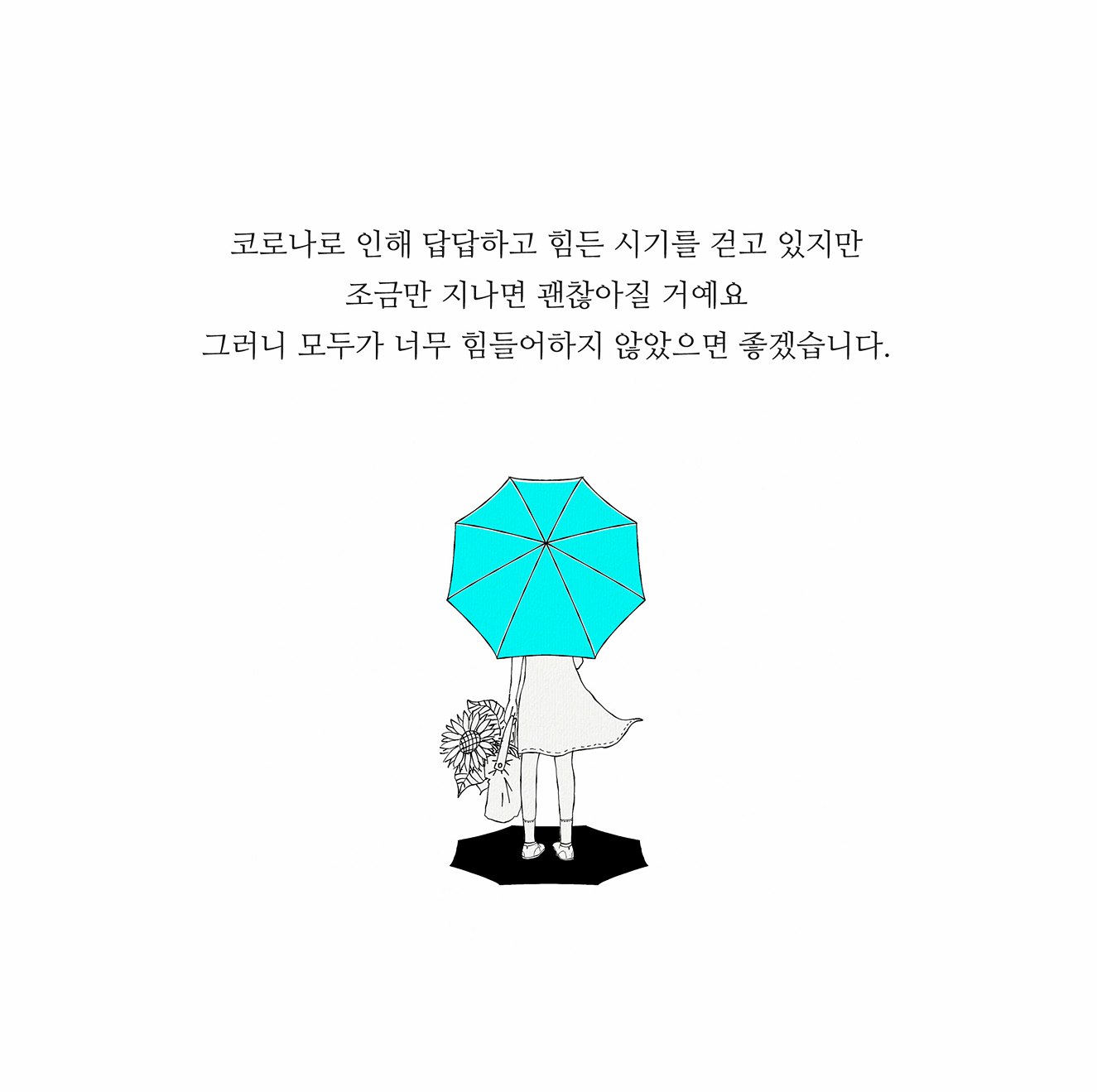 코로나로 인해 답답하고 힘든 시기를 겪고 있지만 조금만 지나면 괜찮아질 거에요. 그러니 너무 힘들어하지 않았으면 좋겠습니다.
