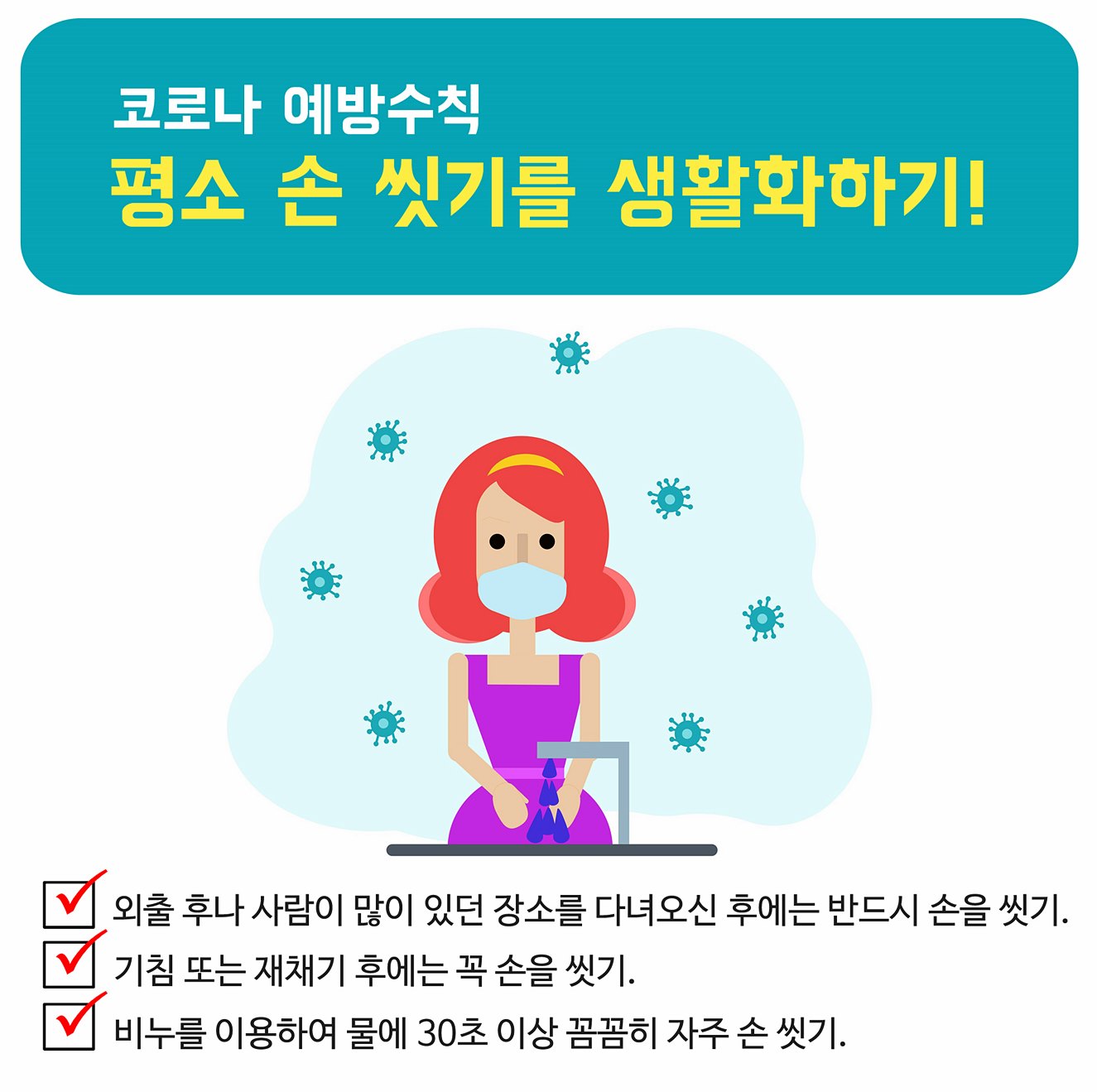 비누를 이용하여 물에 30초 이상 꼼꼼히 자주 손 씻기.