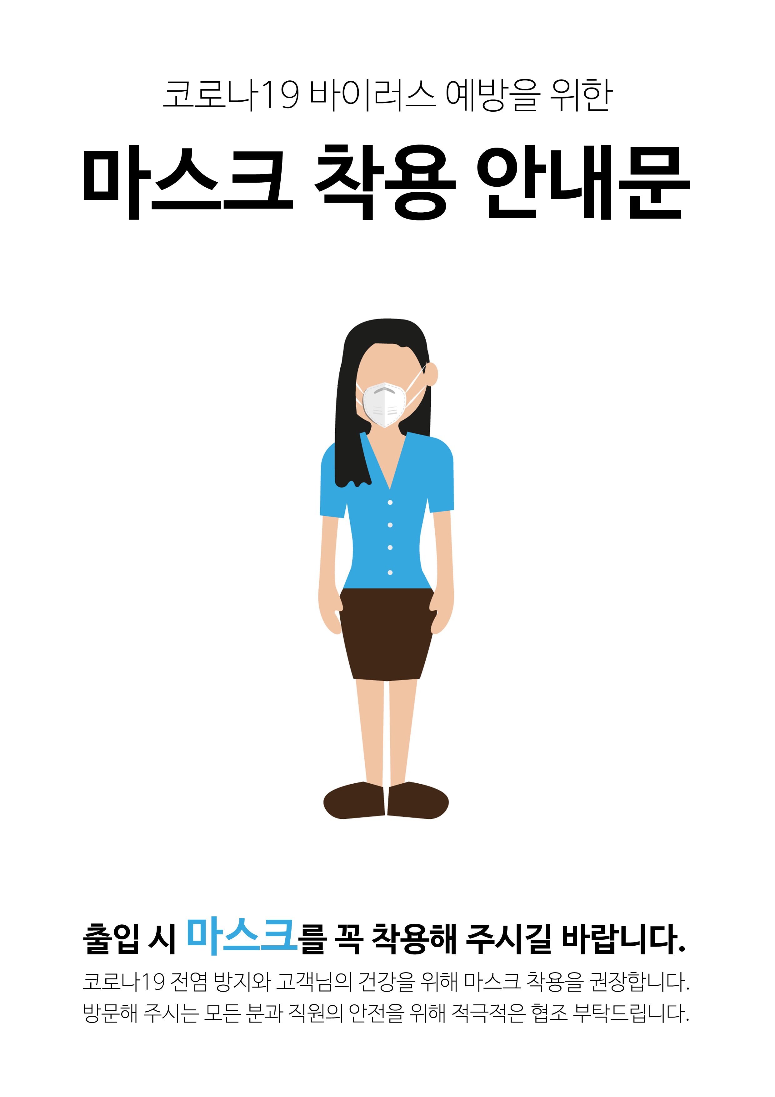 신종 코로나 바이러스 (COVID-19) 확산 예방을 위해 출입 시 마스크를 꼭 착용해 주세요.