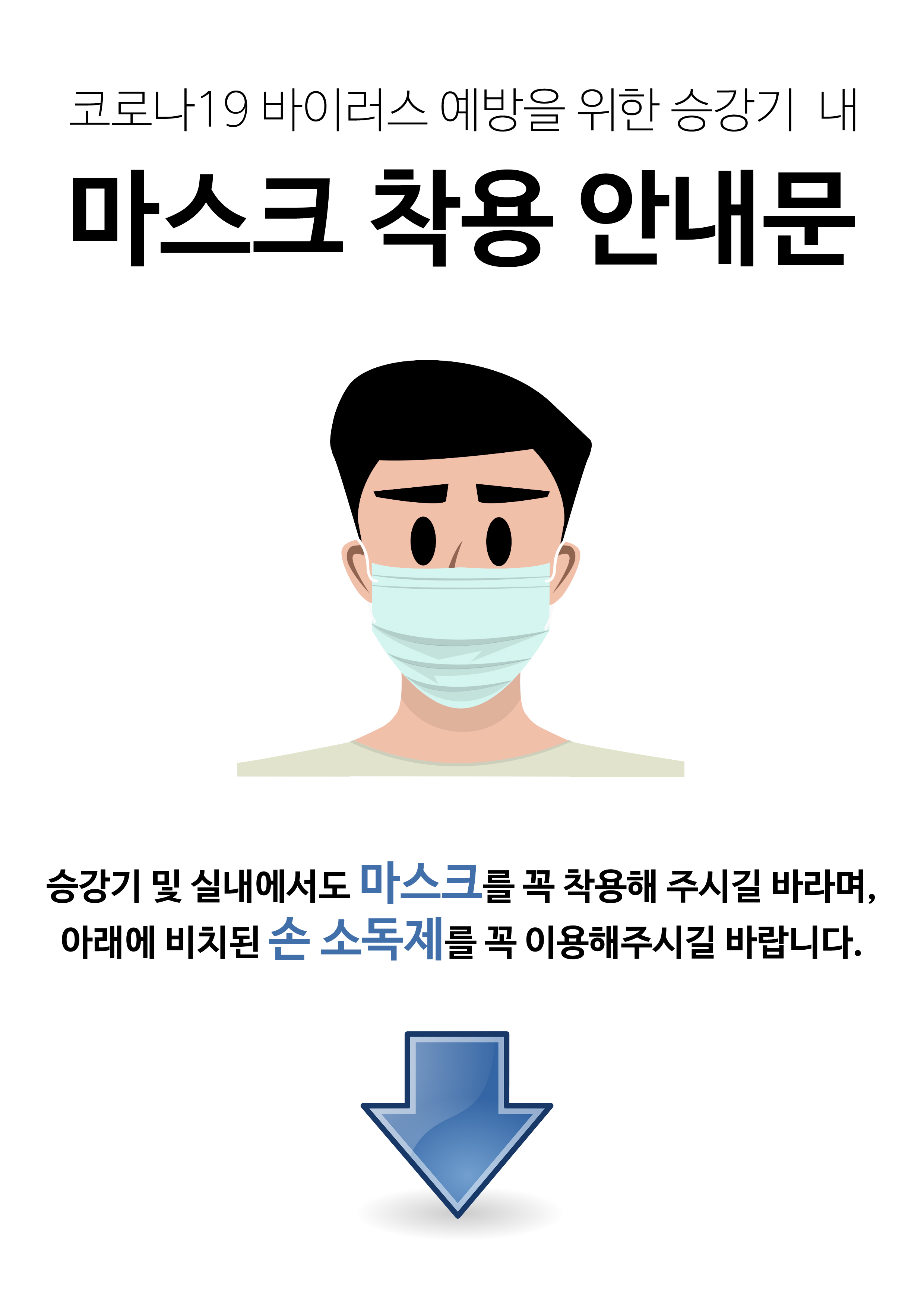 승강기 및 실내에서도 마스크를 꼭 착용해 주시길 바라며, 아래에 비치된 손 소독제를 꼭 이용해주시길 바랍니다.