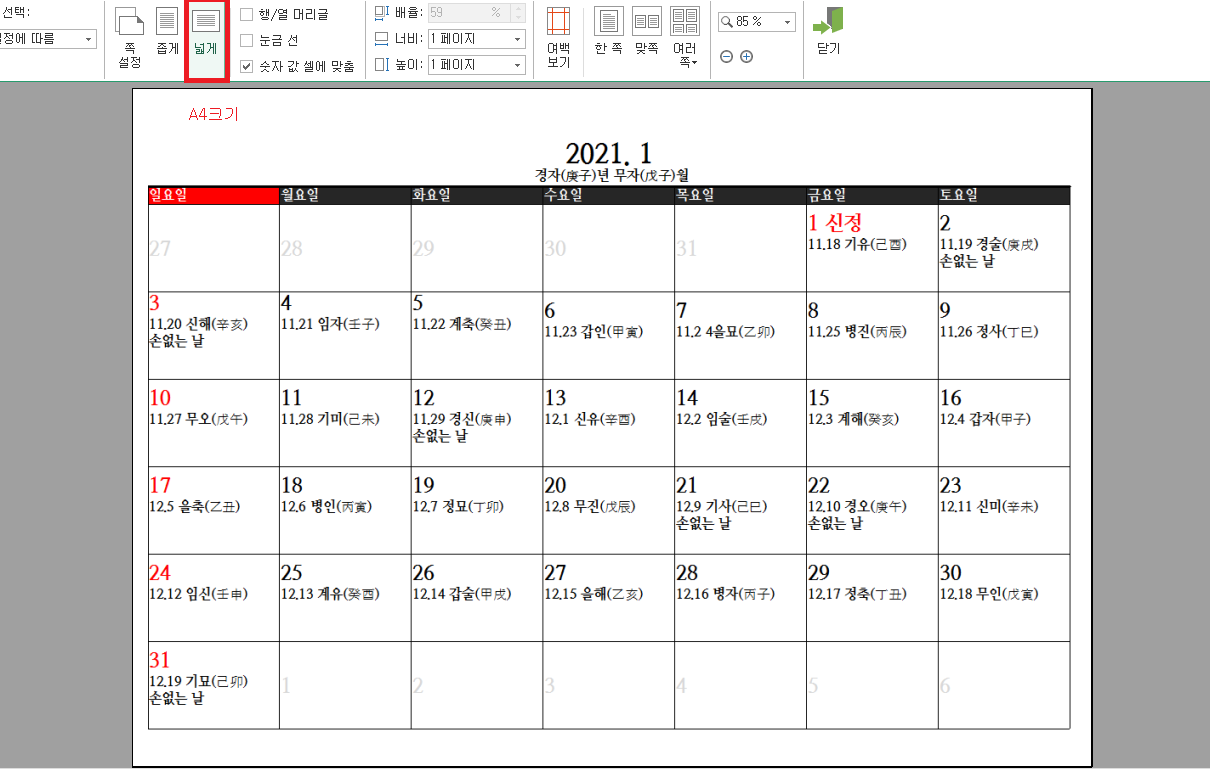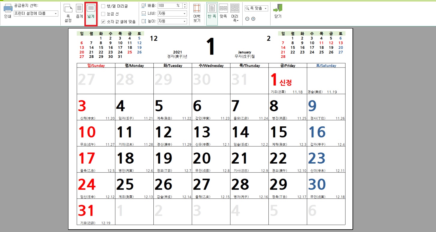 우선 이 파일을 미리보기를 눌렀을때 화면입니다. 위쪽에 빨간색으로 표시된 것처럼 '좁게'가 아닌 '넓게'로 A4 가로 사이즈로 제작을 하였으며, 출력을 하였을때 하나의 용지에 딱 맞는 크기로 출력이 가능합니다. 그러면 이제 본격적으로 달력의 상세 모습을 살펴보도록 하죠.