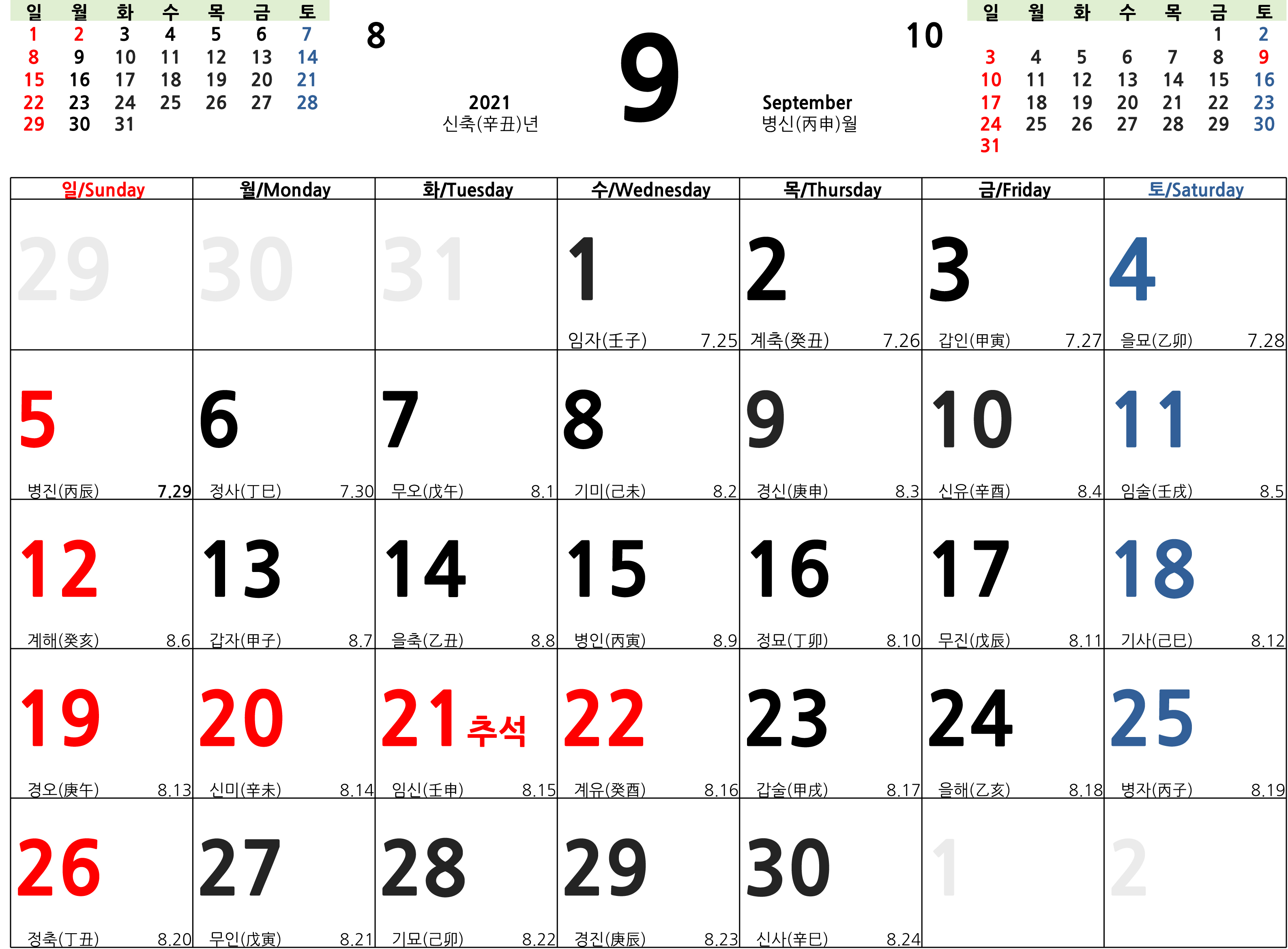 그리고 추석이 들어가있는 대망의 9월 병신월입니다. 추석연휴는 토요일인 18일부터 시작이 될 것 같으며 21일 화요일이 추석 당일이니, 이번 추석에는 연휴가 참 길 것으로 예상되네요.