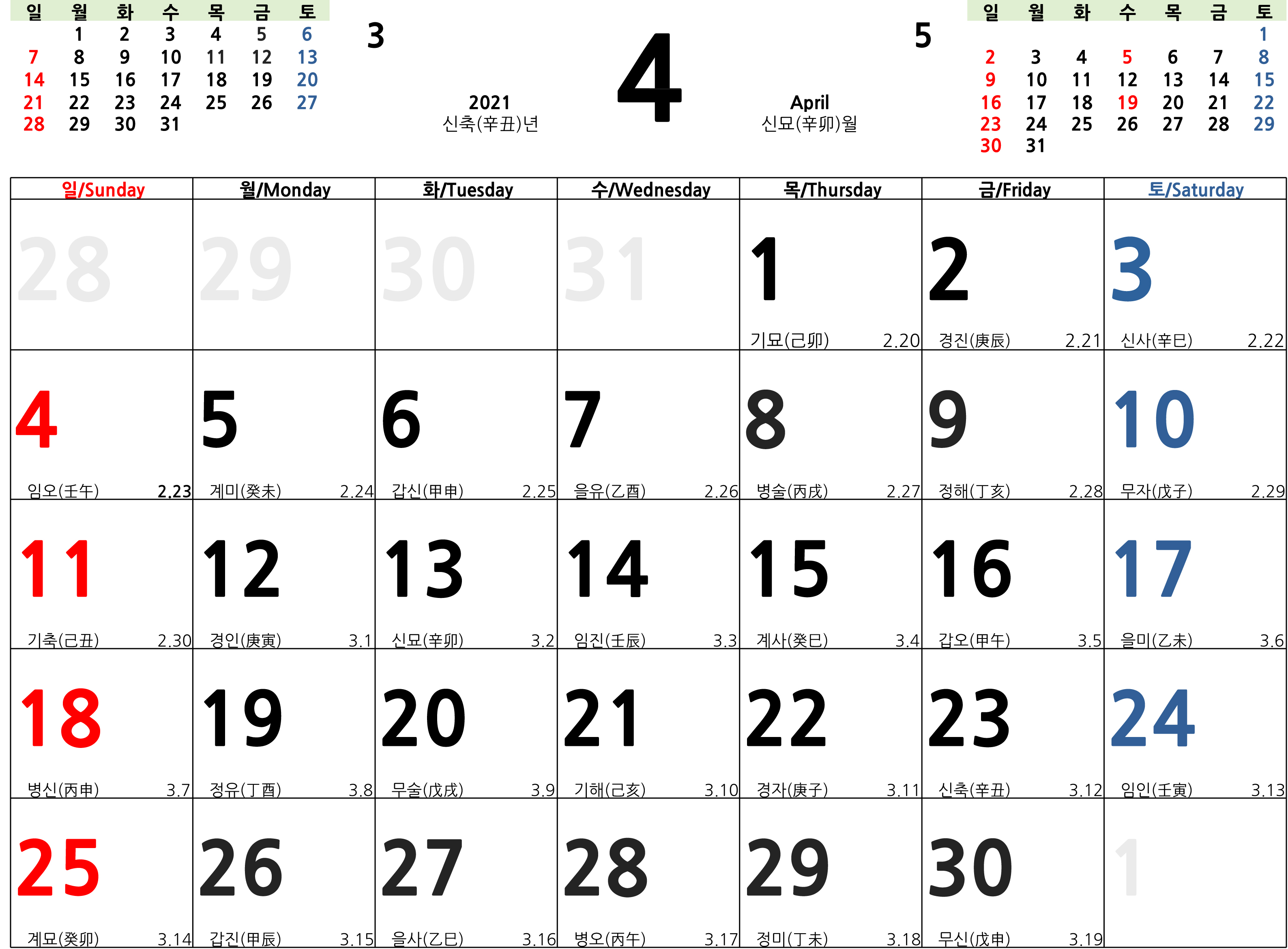 4월 신묘월은 아쉽지만 빨간 공휴일이 없네요. 4월 1일은 목요일부터 시작이 되며 30일 금요일로 끝납니다.