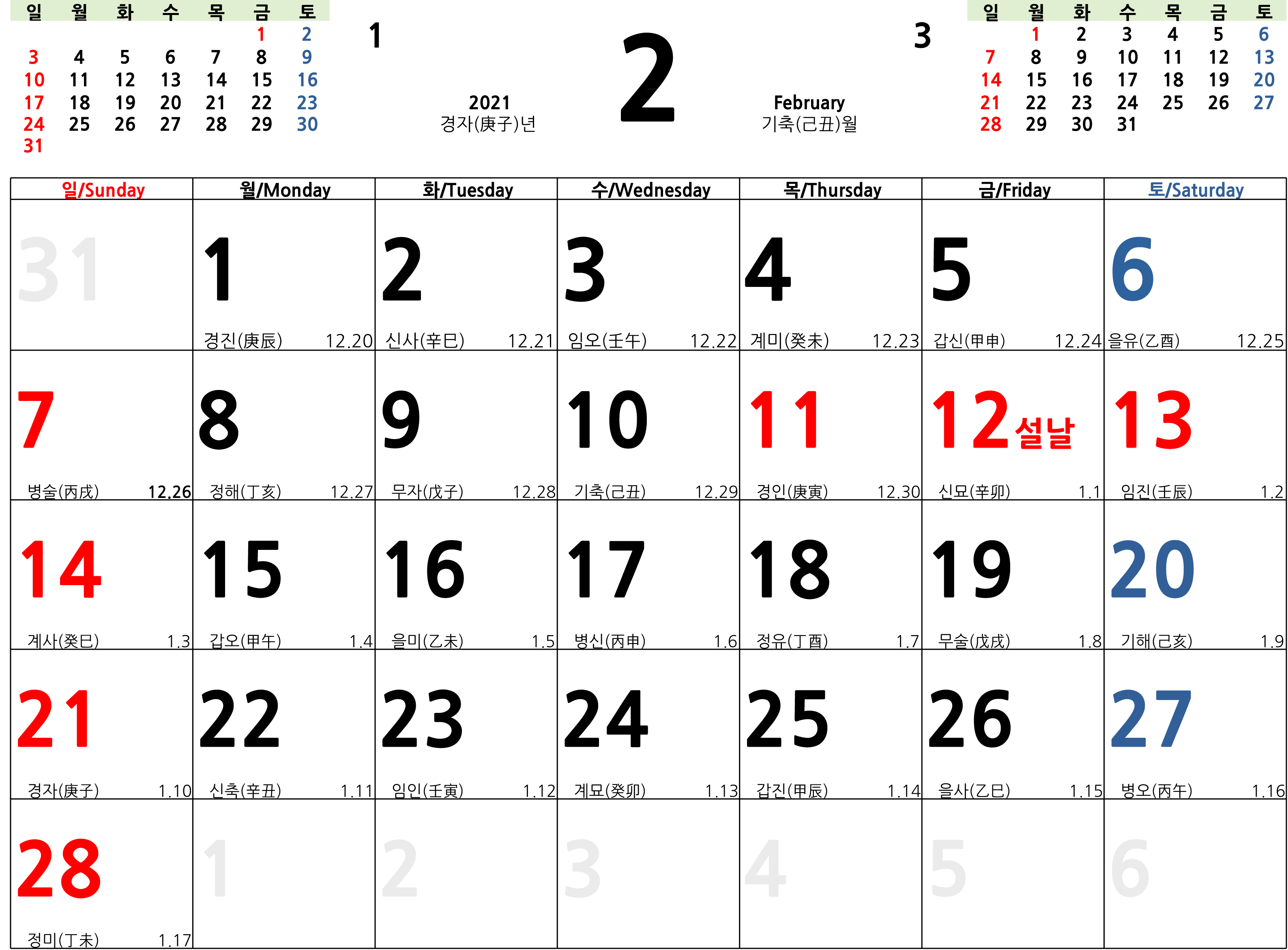 2월까지는 경자년이고요. 2월 기축월 1일은 경진 2일은 신사, 그 다음날은, 임오, 계미, 갑신, 을유, 병술, 정해, 무자, 기축, 경인, 신묘, 임진, 계사, 갑오, 을미, 병신, 정유, 무술, 기해, 경자, 신축, 임인, 계묘, 갑진, 을사, 병오, 정미가 표기되었습니다. 2월 설날은 12일이며, 11일부터 연휴에 들어가는군요.