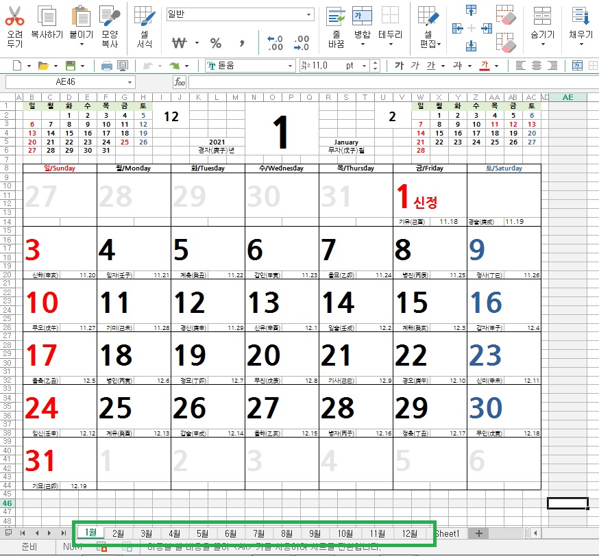 제일 하단쯤에 첨부해드리는 원본 파일 안에는 각 2021년 달력이 각 월마다 sheet(초록색 체크된 부분)로 나눠서 작업을 했습니다. sheet는 작업을 하는 하나의 페이지로 이해하시면 좋을 것 같고요. 하단쪽에 이런 시트를 눌르면 1월부터 12월까지 들어가 있기 때문에 프린트나 인쇄를 하기 위해서는 각 시트를 누르면 되고 파일에서 인쇄를 누르면 됩니다.