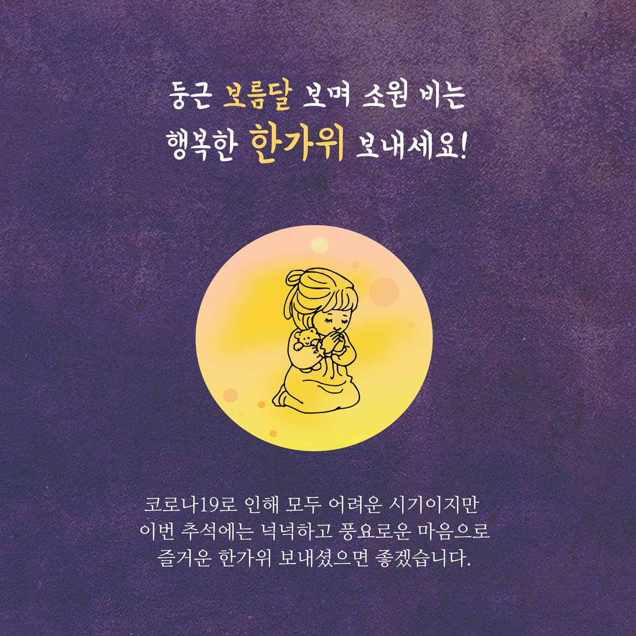 ■ 추석이 다가왔습니다. 모두가 어려운 시기에 추석을 맞이하게 되었지만 소중한 가족, 반가운 친구를 만나 조금이나마 함께 의지하며 이겨냈으면 좋겠습니다. 언제나 웃음꽃이 가득하길 기원하며, 이번 추석도 행복한 연휴가 되셨으면 좋겠습니다.