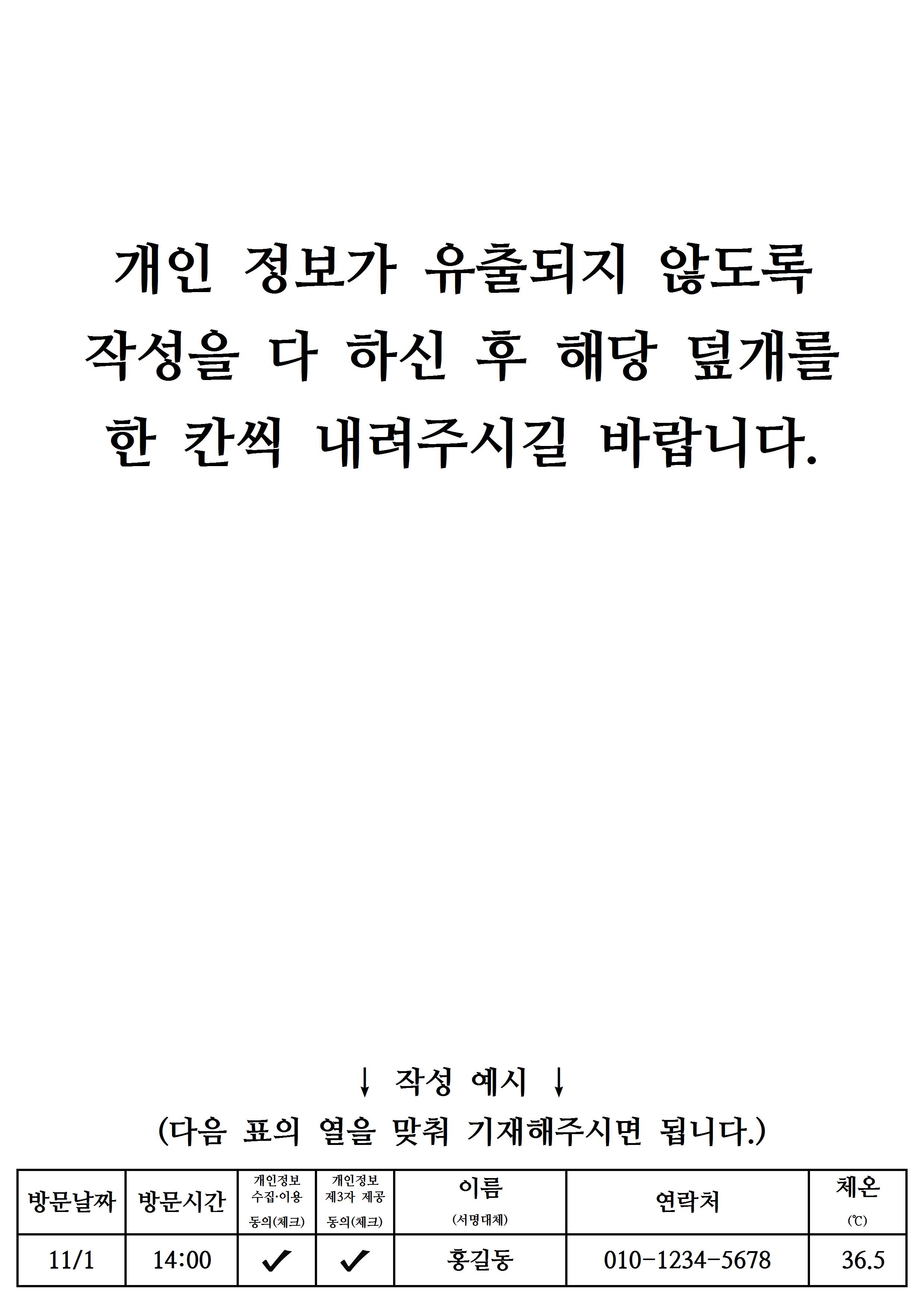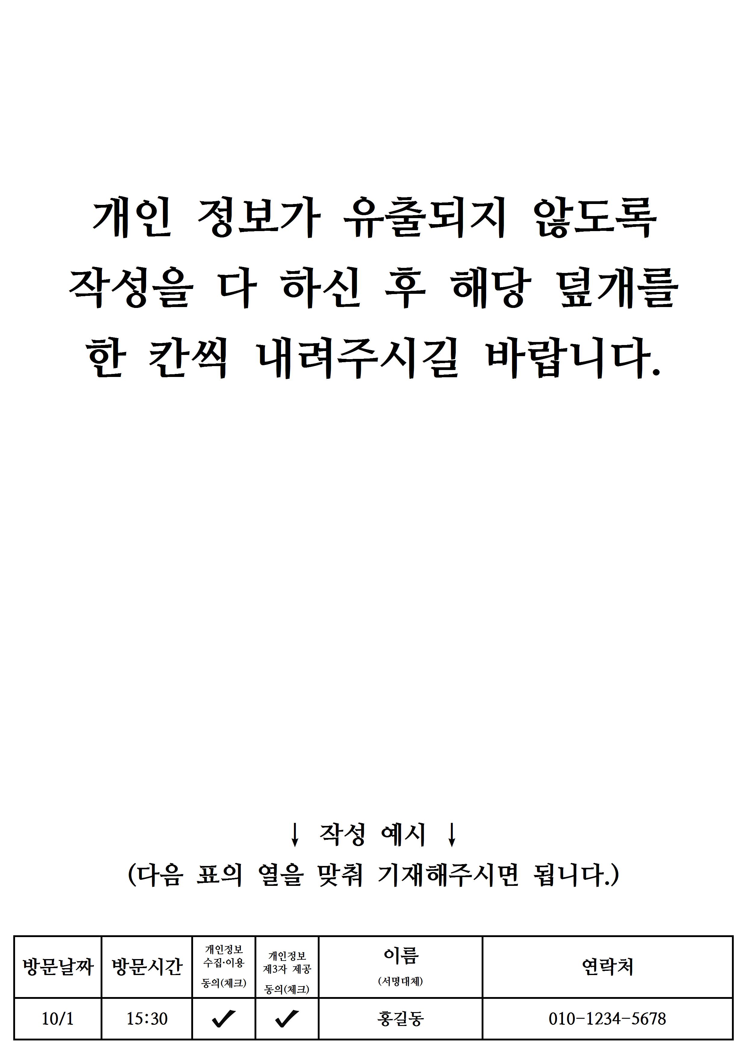 우선 표지없이 위의 덮개 이미지로 사용하셔도 됩니다. 위 덮개 이미지의 용도는 개인정보 유출을 방지하기 위해 아래 이어질 방문록 위에 올려두면서 슬라이딩 형태로 내리며 가려주는 용지입니다. 아래 출입자 수기 명부 표와 같은 열과 표 크기로 하였으니 위의 해당 덮개 이미지를 보고 작성하도록 하시는 것도 좋을 것 같습니다. 잘 구겨질 수 있어서 두꺼운 도화지나 책받침 위에 붙여서 사용해도 좋을 것 같고 작성을 감시하는 관리자가 매장에 있는 것도 개인 정보 유출 방지를 위한 좋은 방법입니다.