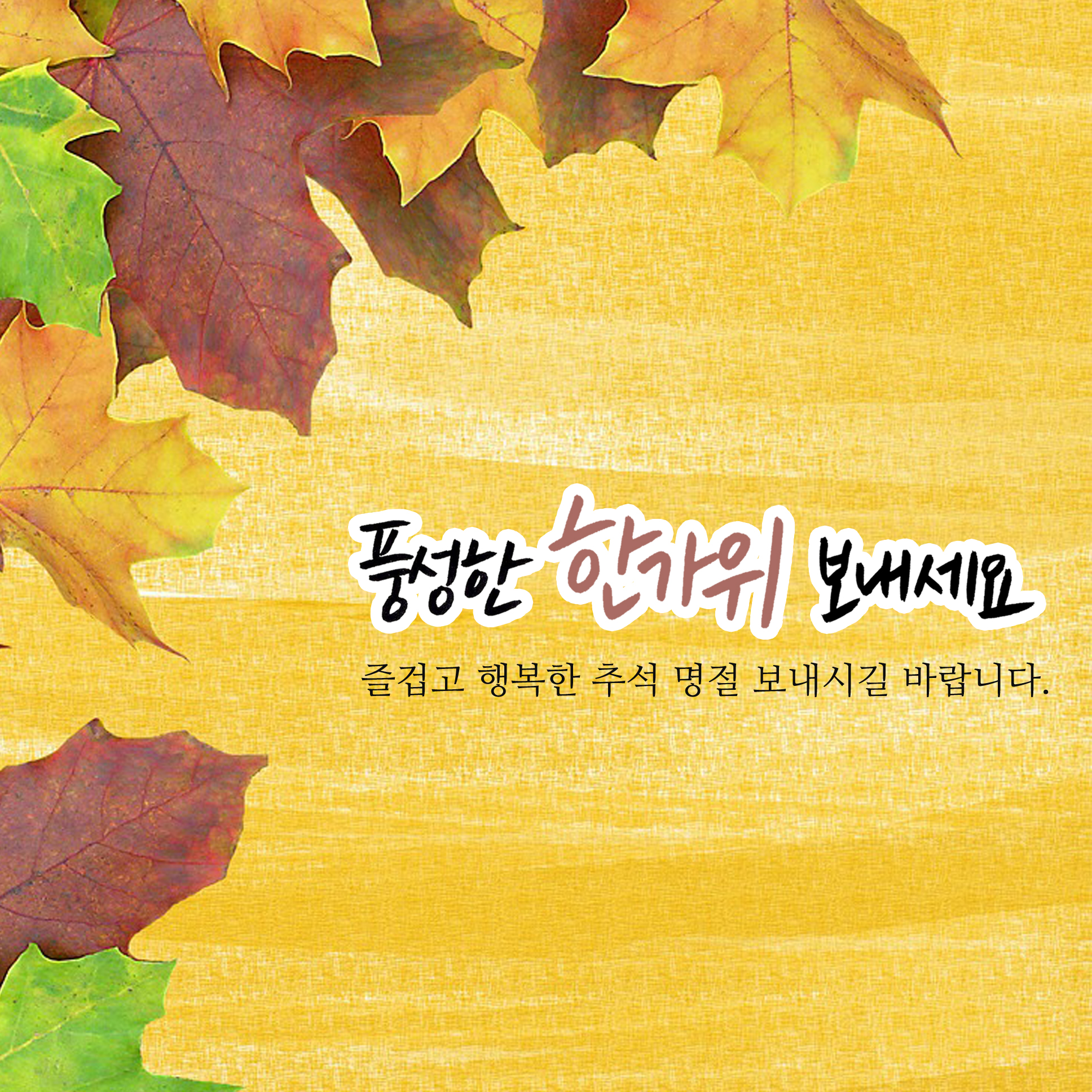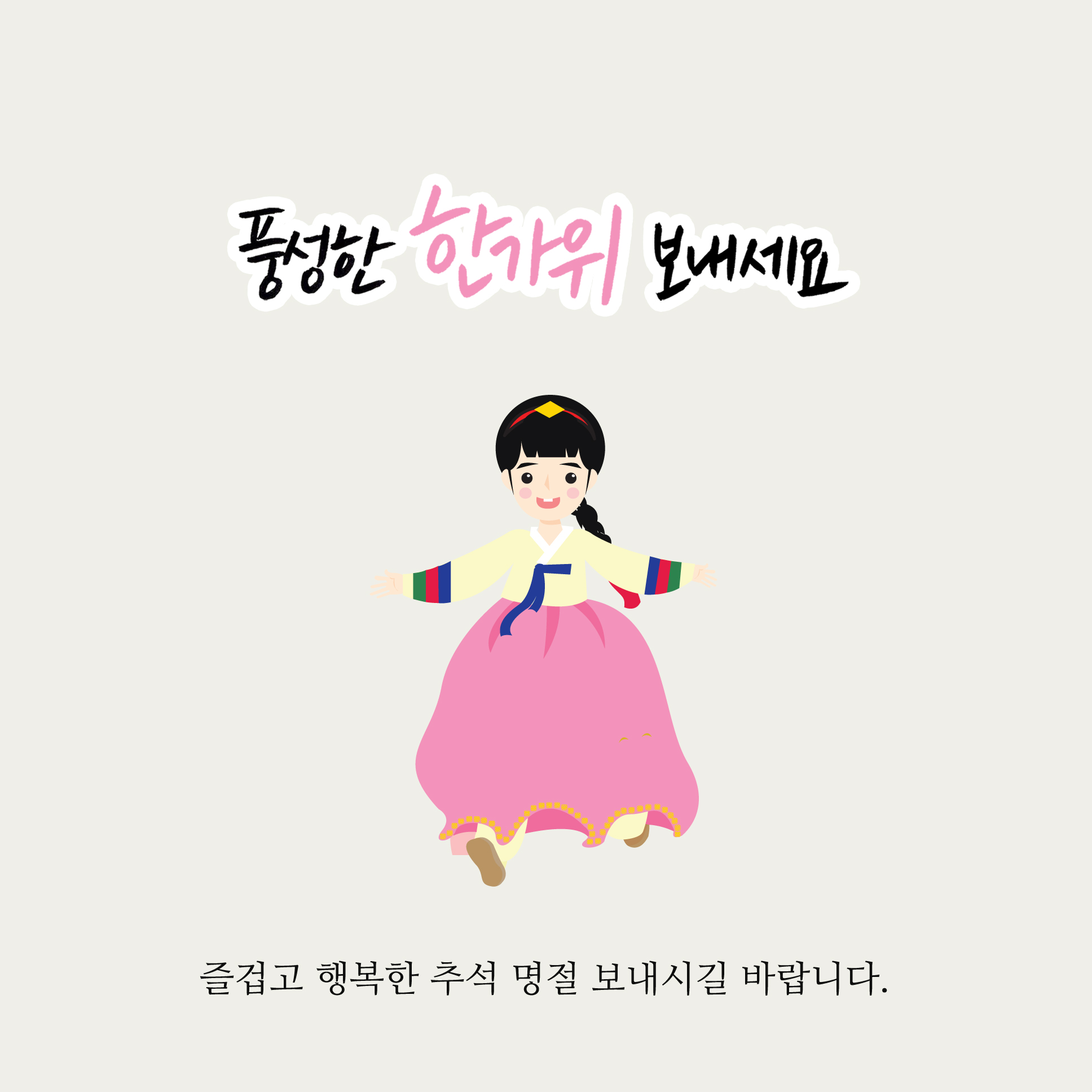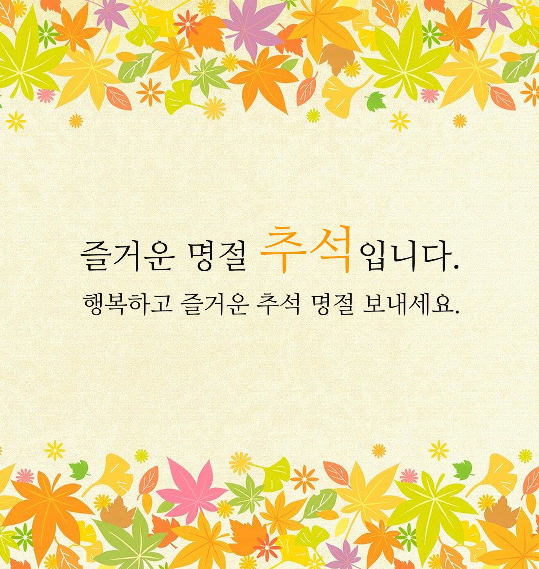 만약 위의 이미지에서 '한가위'라는 단어가 들어간 한가위 인사말 카드를 원하시는 분들이나 위의 이미지와 어울리는 인사말을 찾으시는 경우에는 마찬가지로 앞전에 작성되었던 '추석 인사말 문구 모음집 풍성한 한가위되세요 이미지' 편을 참고하시면 됩니다. 어려운 시기에 추석 명절을 맞이한 분들에게 따뜻한 응원의 메세지를 전하며 풍성한 한가위를 같이 맞이할 수 있는 그런 즐겁고 행복한 추석이 되었으면 좋겠습니다. 궁금하신 점 또는 아쉬웠던 점이 있으시면 아래 댓글로 편하게 남겨주시면 바로바로 답을 드리거나 다음 글을 제작하는데 참고하도록 하겠습니다.