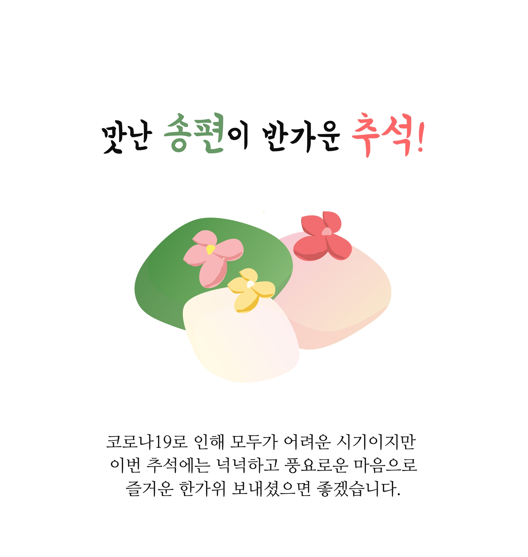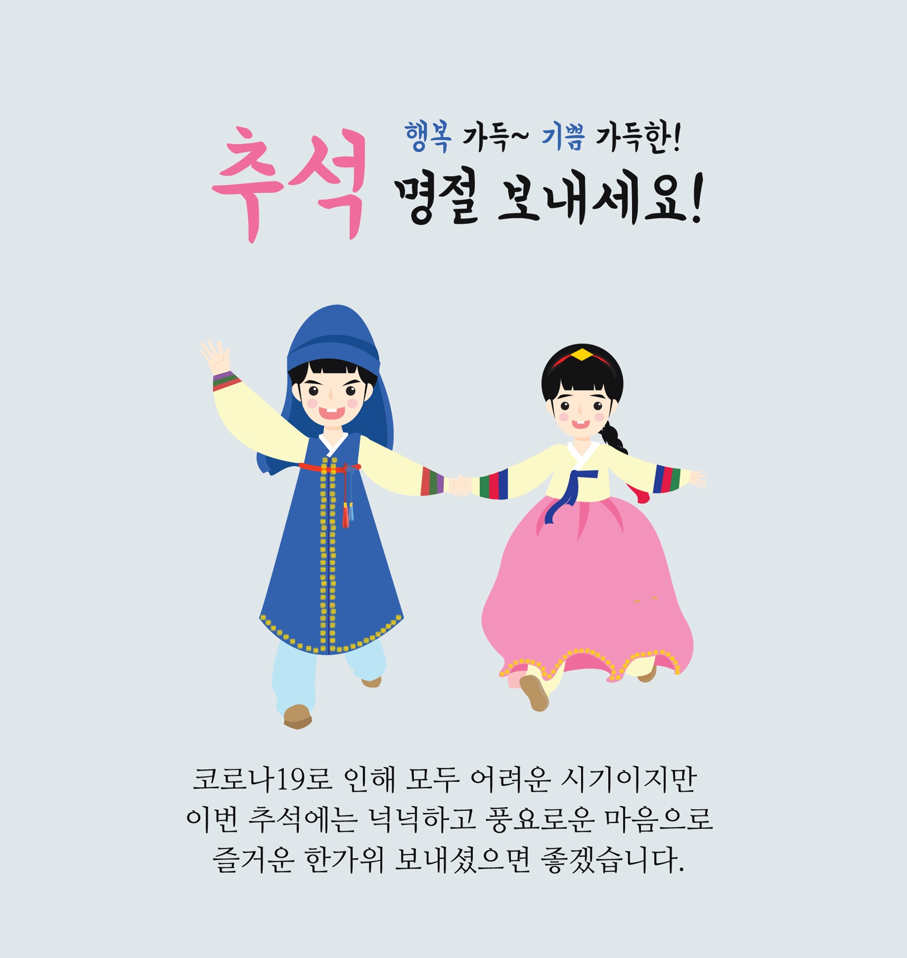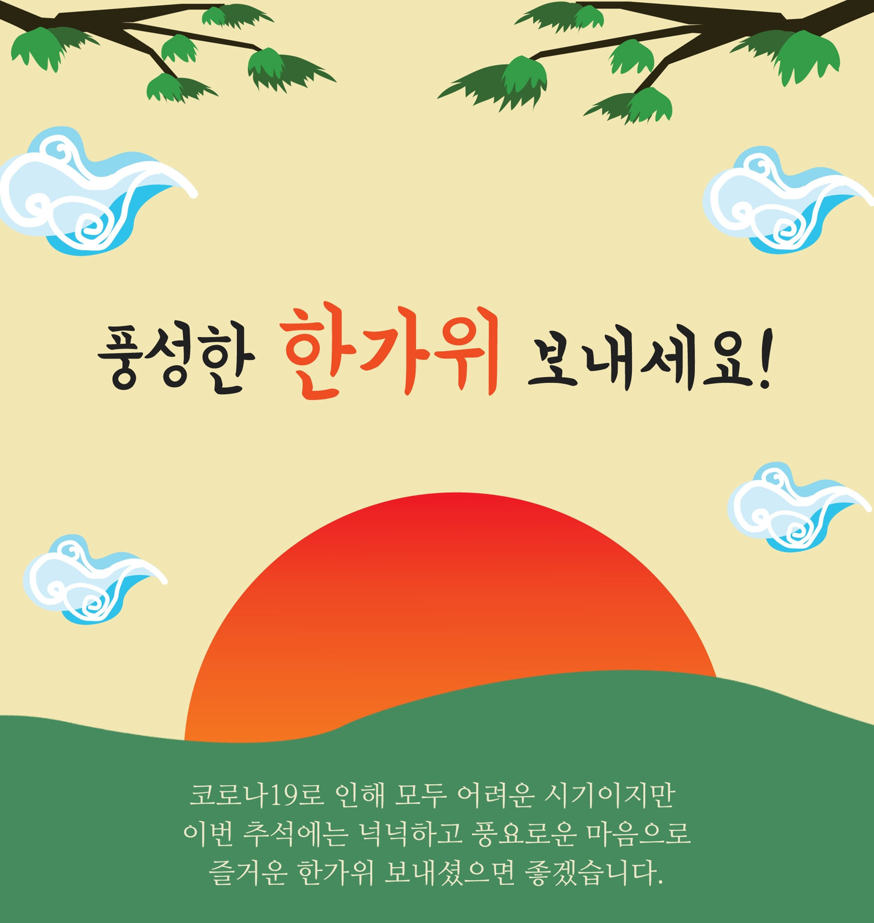 '코로나19로 인해 모두가 어려운 시기이지만 이번 추석에는 넉넉하고 풍요로운 마음으로 즐거운 한가위 보내셨으면 좋겠습니다'라고 적혀있는 예쁜 이미지입니다.