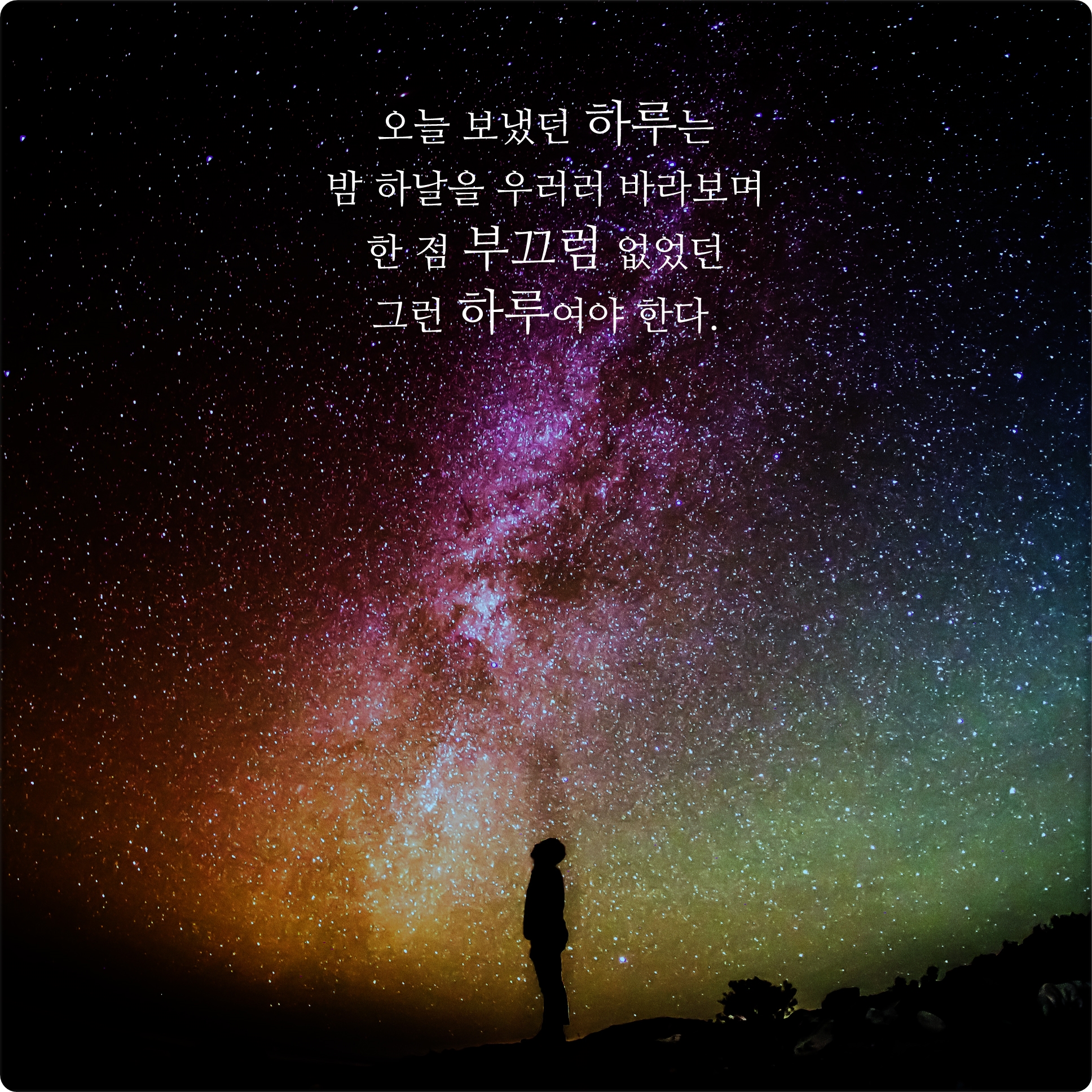 아침의 일과에서부터 저녁 늦은시간까지 보냈던 오늘의 일까지. 그 일들이 다시 한 번 되돌아봤을때 후회하지 않을만큼 의미가 있는 시간과 활동들로 가득 채워야 한다. 밤 하늘을 보고 그리고 내가 바라고 있는 반짝이는 꿈을 보고 오늘의 있었던 하루는 반드시 후회없는 최선의 하루가 되었으면 한다. 그리고 정정당당하고 떳떳하게 얘기할 수 있어야 한다.