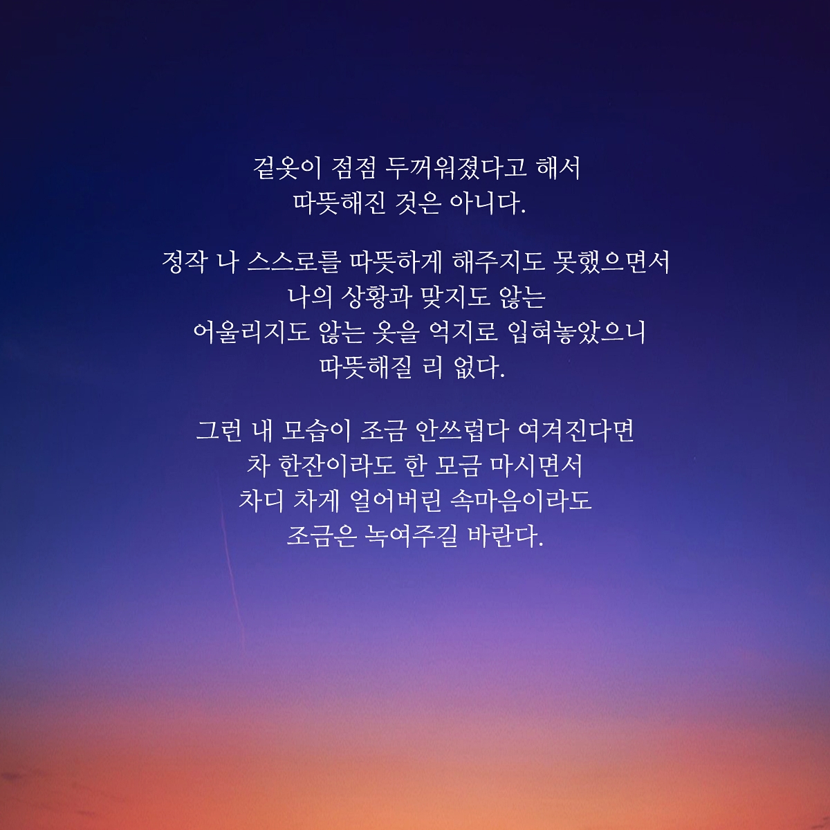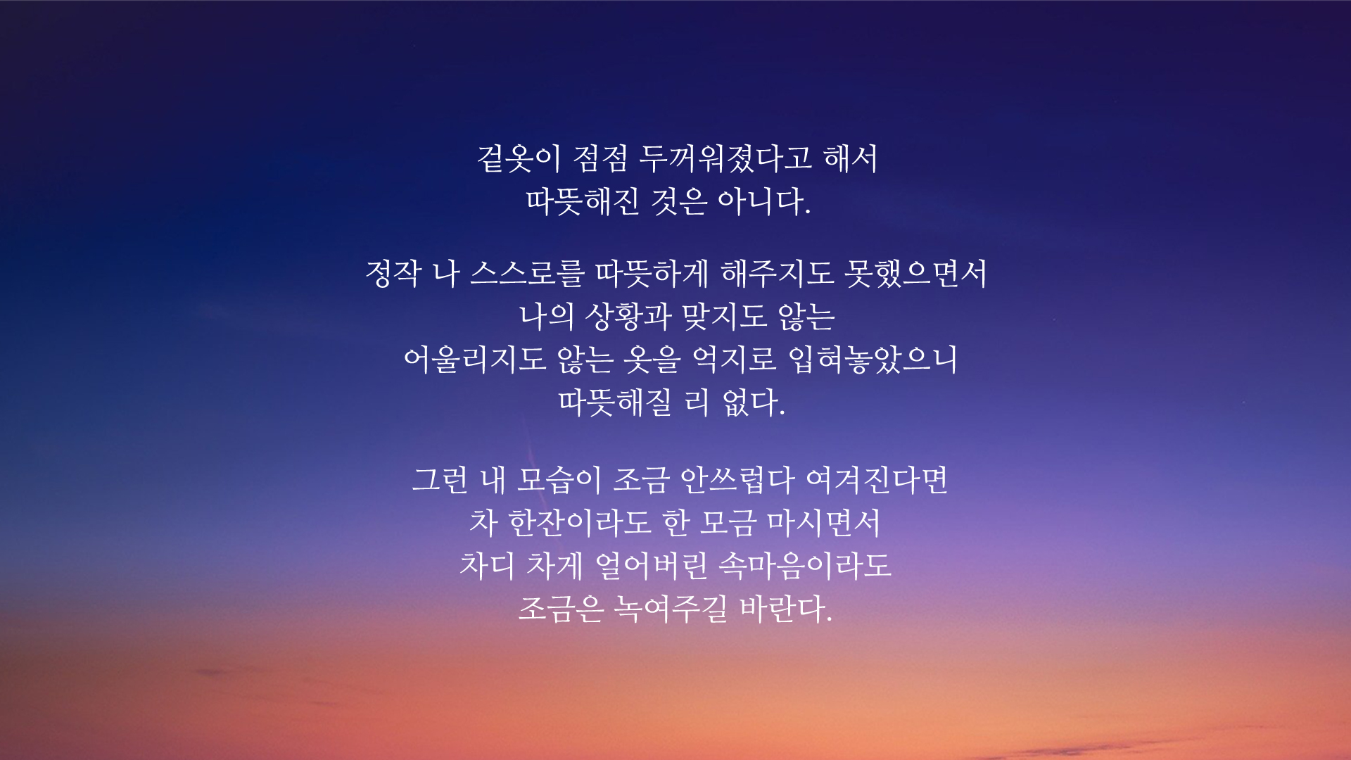 날씨가 차가워지면 춥다고 느껴 몸을 따뜻하게 해주기 위해 겉옷을 입습니다. 하지만 몸은 따뜻해지었을지언정, 마음만큼은 따뜻해지지는 않는 것 같습니다. 어쩌면 나 자신을 너무 혹사시키고 많은 것들을 잃어버리게 했으며, 좌절감과 상실감을 가득 안겨주었는데.. 그런 상황에 몸은 따뜻해지라고 겉옷을 입히려 하니.. 맞질 않는 옷을 입힌 것은 아닌가 생각이 듭니다. 마음만큼은 나 스스로가 차갑게 혹사시켰는데 말이죠.