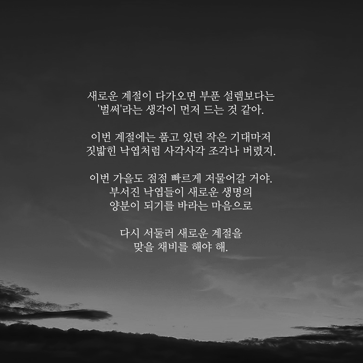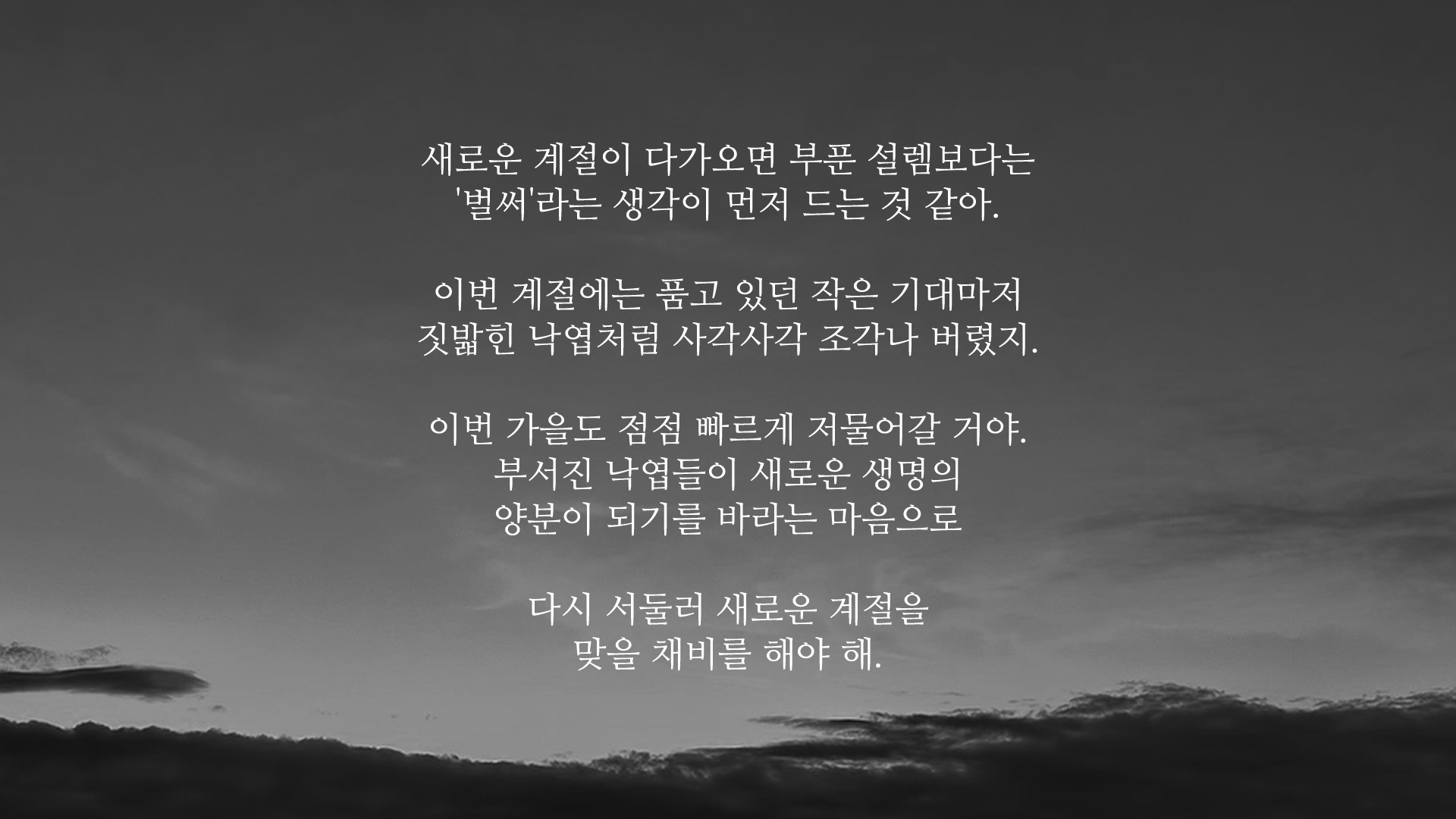 시간은 너무나 빠르게 흘러가고 있습니다. 이번 가을도 유독 빠르게 지나가버리겠죠. 빠르게 흘러가는 시간 속에서 작은 바람이 있다면 전보다는 조금 더 나아지기를 지금의 시기가 밑거름이 되어 조금은 나을 수 있는 따뜻한 계절이 찾아왔으면 합니다.