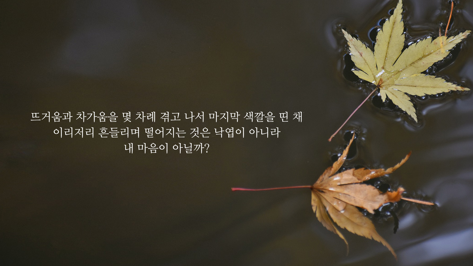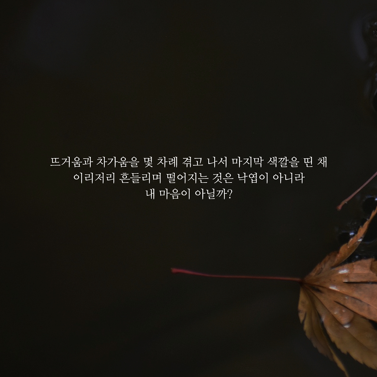 나무에 매달려있는 낙엽을 보면 언제떨어질지 모르게 위태롭게 흔들리는 모습을 봤었습니다. 떨어질 듯 말 듯.. 이리저리 좌우로 흔들리며 언젠가는 떨어질 것 같은 가을 나무의 낙엽. 어쩌면 위태롭게 흔들리는 것은 낙엽이 아니라 내 마음이 아닐까 생각이 듭니다. 마음의 여유도 잃어버린, 별것도 아닌 상황에 불안해하는 그런 마음 말이죠.