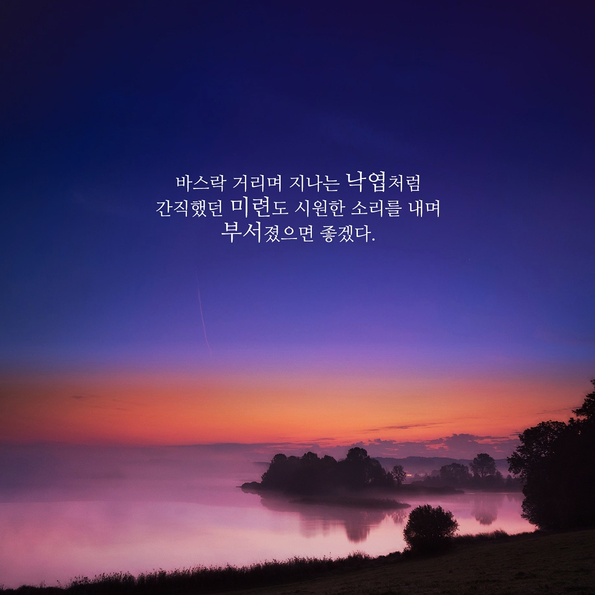 누군가를 좋아했지만 그것이 좋은 결실로 이루어지지 못했을때.. 나는 마음이 똑같지만 상대방은 그게 아닐 때. 문득 이런 생각이 듭니다. 그냥 가을날에 낙엽이 우거진 가을길을 걸으면서 사각사각 부서지는 가을의 낙엽처럼 모든 게 부서졌으면 좋겠습니다. 뒤돌아 봤을 때는 그러한 미련의 낙엽들이 모두 사라졌으면 좋겠습니다.