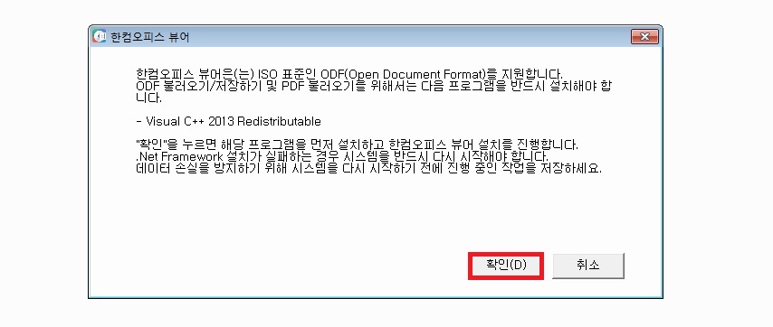 저는 Visual C++ 2013이라는 프로그램이 없어 위와같은 알림 창이 하나 떴습니다. 한글 뷰어를 다운로드하고 열기 위해서는 위의 파일이 필요한가 봅니다. 확인을 누르시면 됩니다.