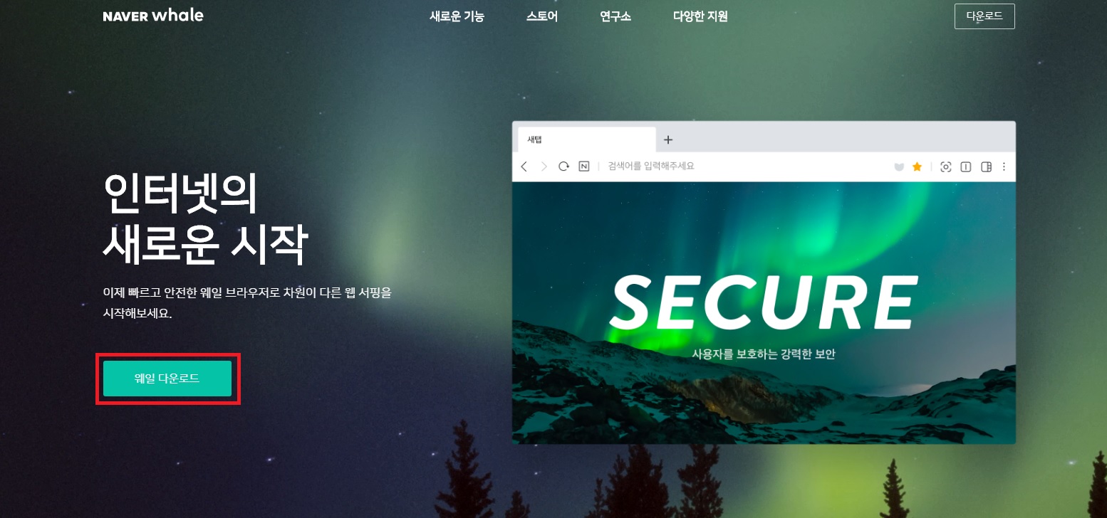 화면에서 '웨일 다운로드'를 누릅니다. 그러면 다운로드가 시작이 되고~