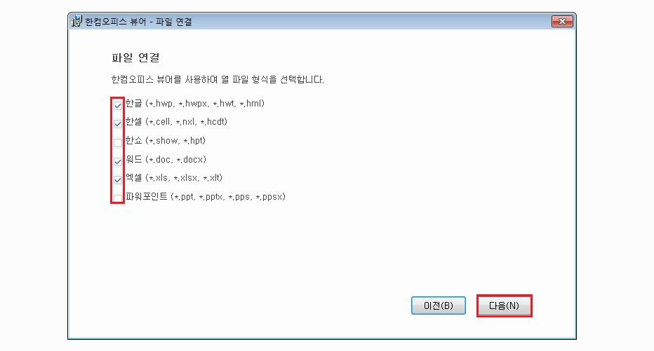 그러면 파일 연결 선택란이 뜨는데요. 그러니까 내가 보고자 하는 파일 형태가 어떻게 되어있는지를 선택하는 부분입니다. 정리하자면 한글 뷰어도 해당이 되지만 한컴오피스 뷰어는 다양한 문서들을 열 수 있는 종합 뷰어 프로그램인 셈이죠. 저는 필요할 것 같은 프로그램이 많을 것 같아서 통상적으로 많이 쓰이는 한글, 한셀, 워드, 엑셀을 선택하였습니다. 만약 hwp, hwpx, hwt, hml 파일만 여는 것이라면 그냥 첫 번째 '한글' 부분만 체크하셔도 무방합니다.