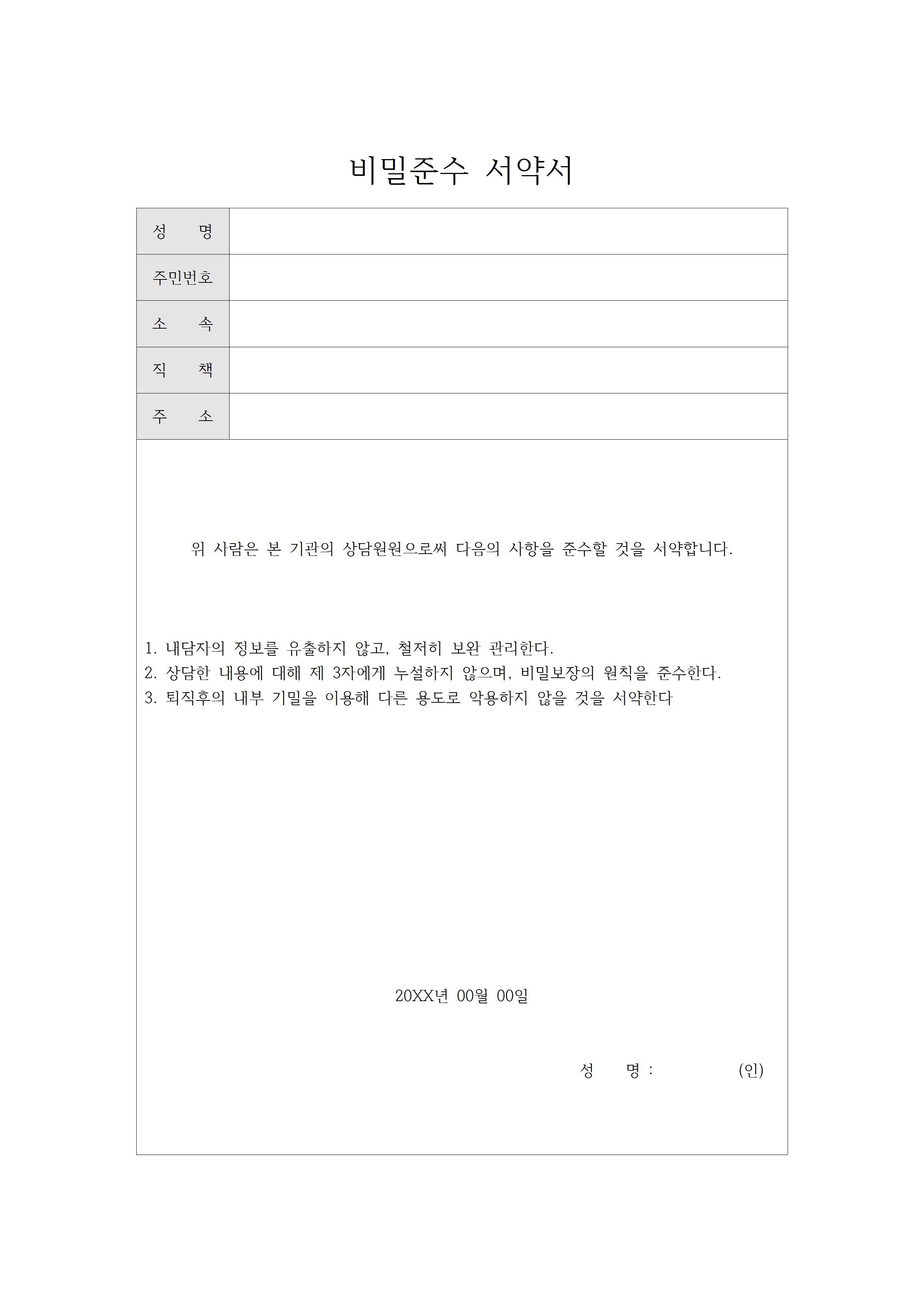 다음은 도서관이나 동사무소, 행정관련 복지센터 등에서 활용할 수 있는 기관 비밀준수 서약서입니다. 또는 카페나 편의점, 식당, 요식업 등 업장의 상황에 맞게 서약 내용을 직접 추가하고 수정을 하여 작성하시면 되십니다.