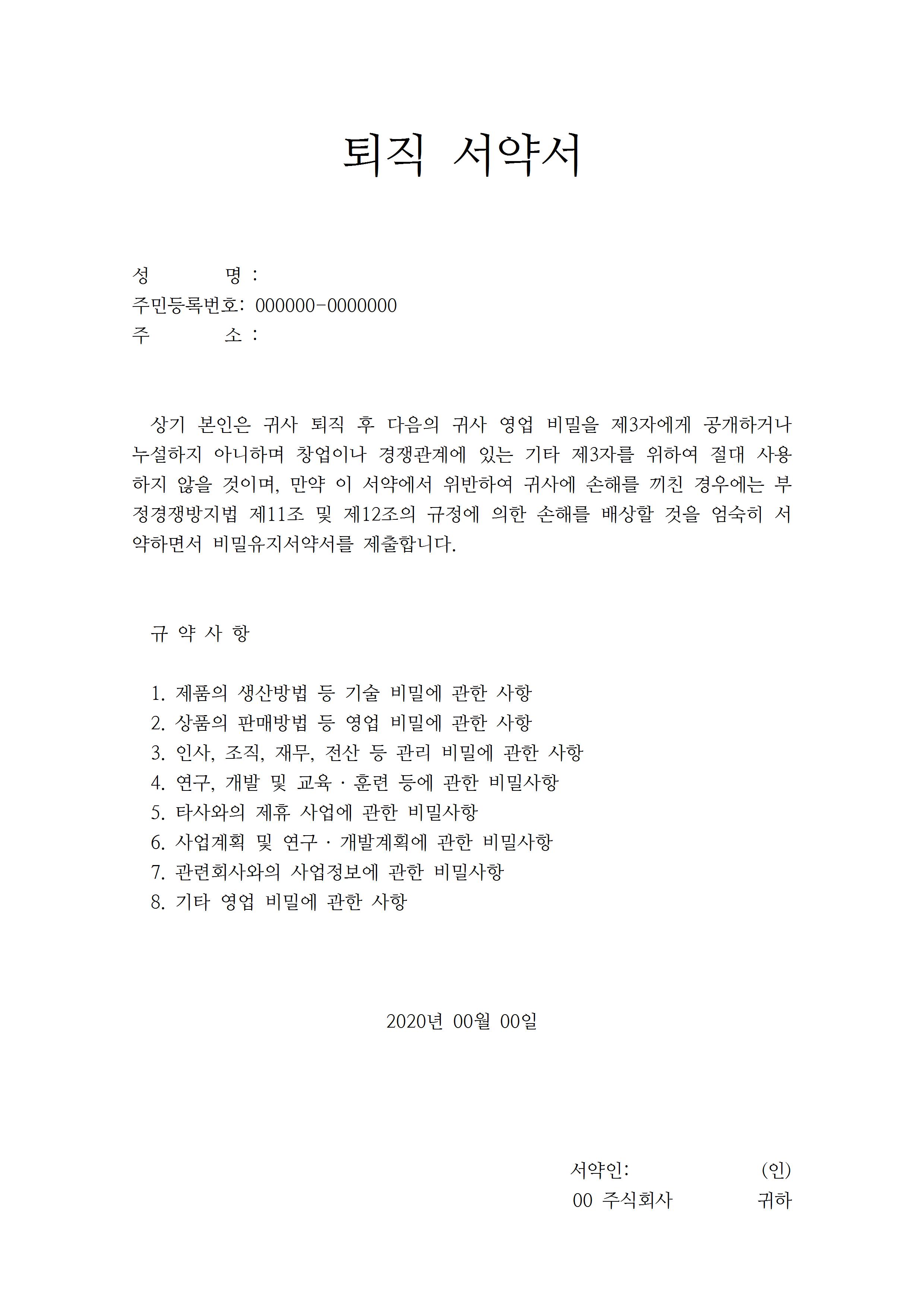 상기 본인은 귀사 퇴직 후 귀사의 영업비밀을 제3자에게 공개 또는 누설하지 아니하며, 창업이나 경쟁관계에 있는 기타 제3자를 위하여 절대 사용하지 않을 것이며, 만약 이 서약서에 위반하여 귀사에 손해를 끼친 경우에는 부정경쟁 방지법 제11조 및 제12조의 규정에 의한 손해를 배상할 것을 엄숙히 서약하면서, 비밀 유지 서약서를 제출합니다.