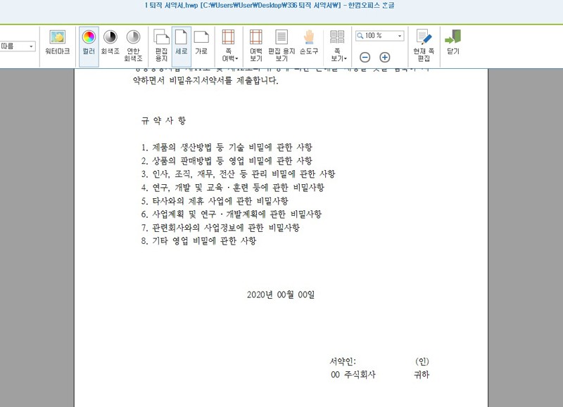 우선 구성은 퇴직 서약서와 퇴사 서약서를 모두 이미지와 한글 파일 두가지로 각각 첨부를 한 모습이며, 해당 한글 파일로 무료 다운로드를 하여 저장을 한 후 그 파일을 열었을 때의 화면입니다. 일반적으로 나와있는 서약서의 문구 내용을 직접 작성을 한 것이기 때문에 수정이 필요한 경우에는 원본 파일로 저장을 하셔서 내용을 조금씩 수정하시면 됩니다. 유의할 점은 너무 빨리 살펴보시지 마시고 문서에 대한 부연 설명도 자세하게 다뤄볼 테니까 천천히 내용을 살펴보시면서 해당되는 양식을 정확하게 저장하시면 되고요.