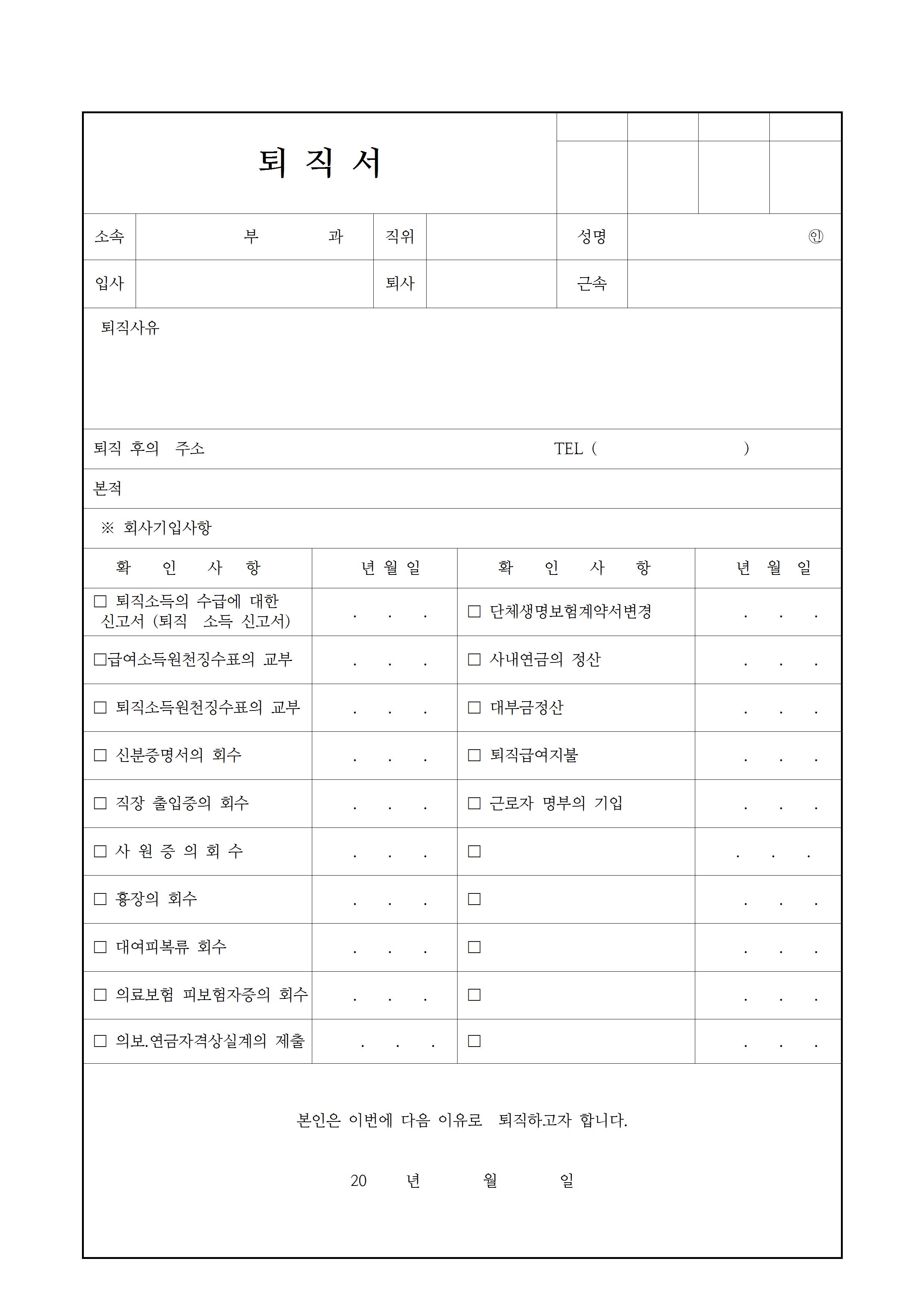 다음은 회사기입사항 또는 확인사항을 체크하는 칸이 있는 양식입니다. 만약에 영업직이라면 퇴사하기 전에 반납해야 할 물품이나 서류 등이 있으니 확인해야 할 사항을 근무지의 상황에 맞게 수정하셔서 만드시면 좋을 것 같네요.