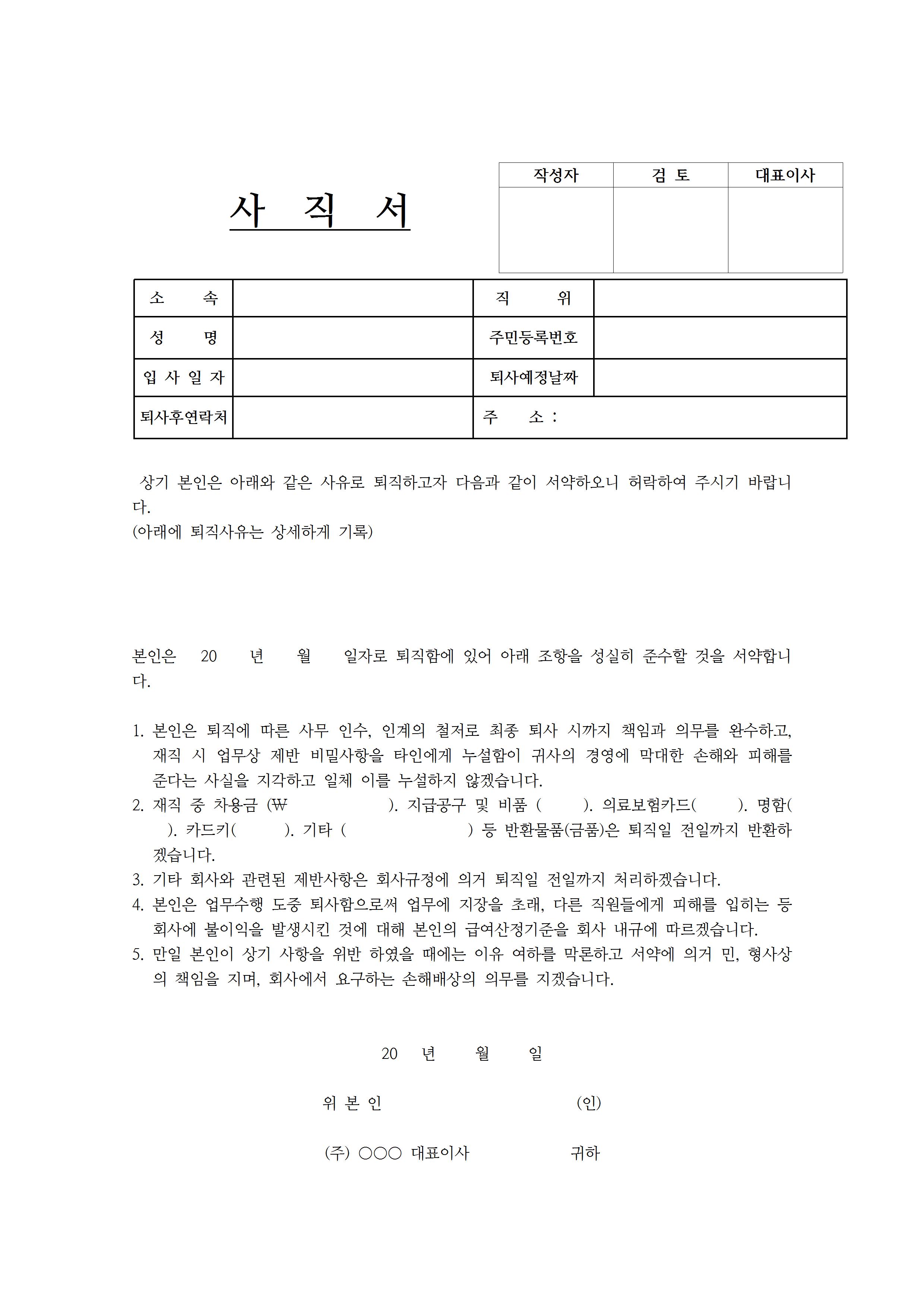 다음은 규약 사항들을 1번부터 5번까지 구체적으로 기재되어 있는 사직서 양식입니다. 조항들은 기업 내에 상황에 따라 다를 수 있으므로 만약 정해져 있는 조항들이 있다면 조금씩 수정을 하시면 됩니다.