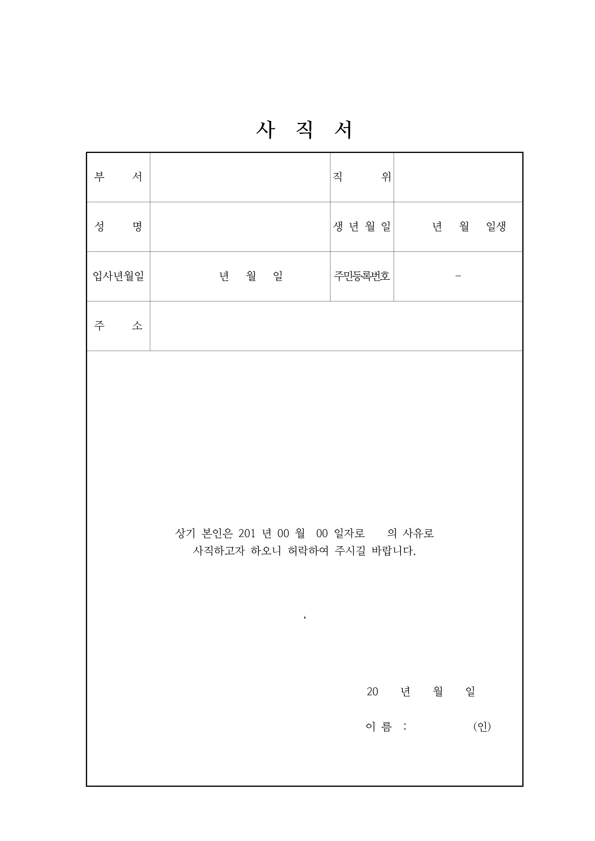 마찬가지로 깔끔하고 단순한 구성으로 이루어진 사직서이고요.