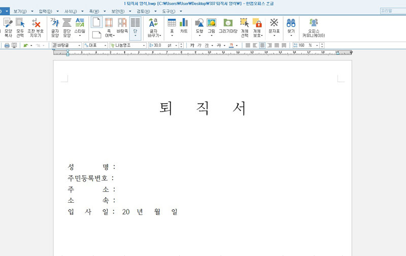 우선 총 10가지는 한글파일로 이루어졌으며, 한글 원본을 들어갔을때 모습입니다. '퇴직서'를 '사직서'로 변경하거나 기입 사항에 내용을 추가하거나 삭제 또는 수정사항이 있다면 각 파일에 첨부될 한글 원본으로 들어가서 상황에 맞게 수정을 하셔서 작성하시면 됩니다.