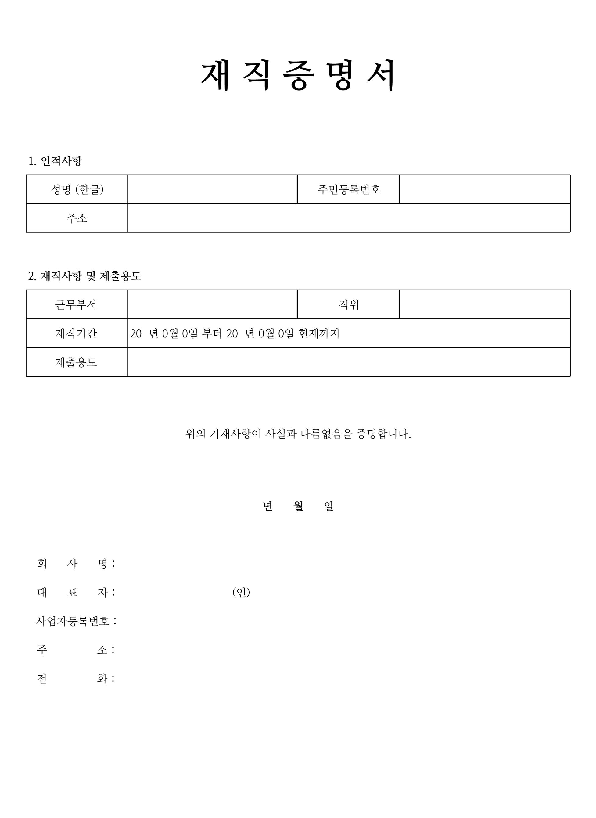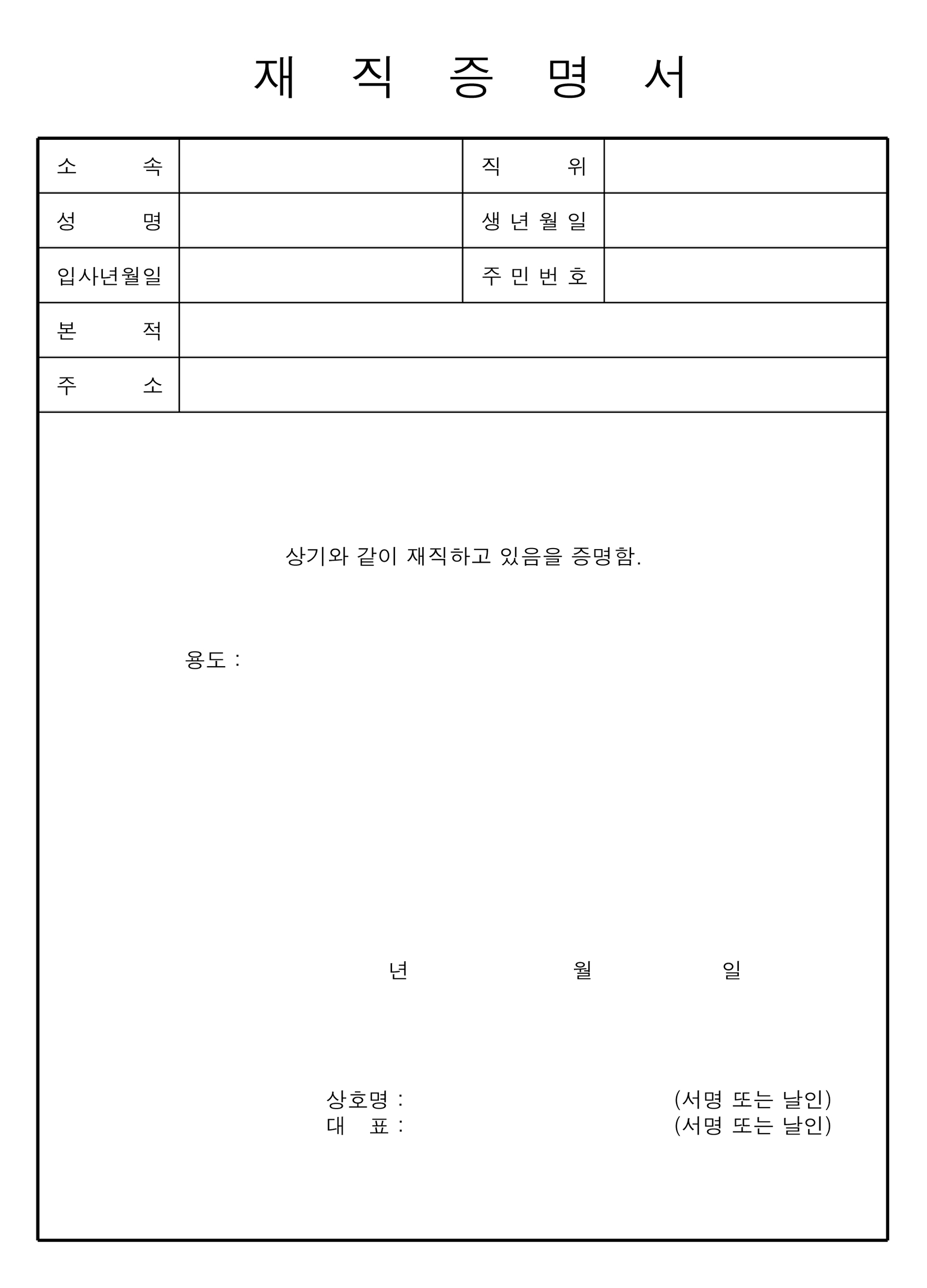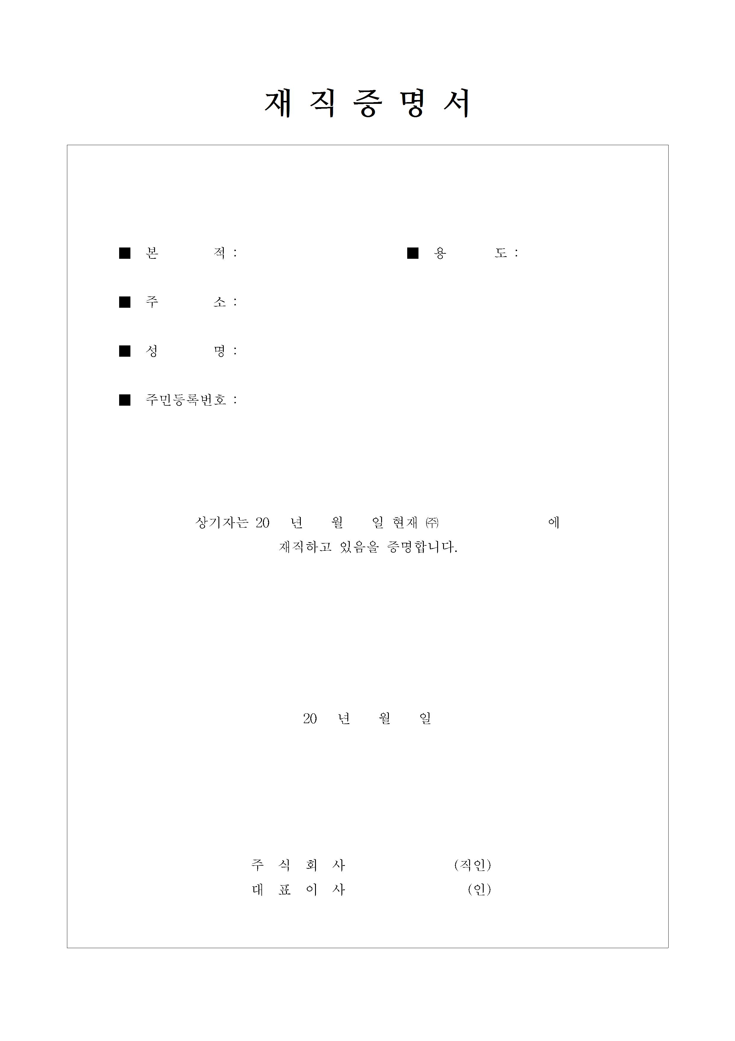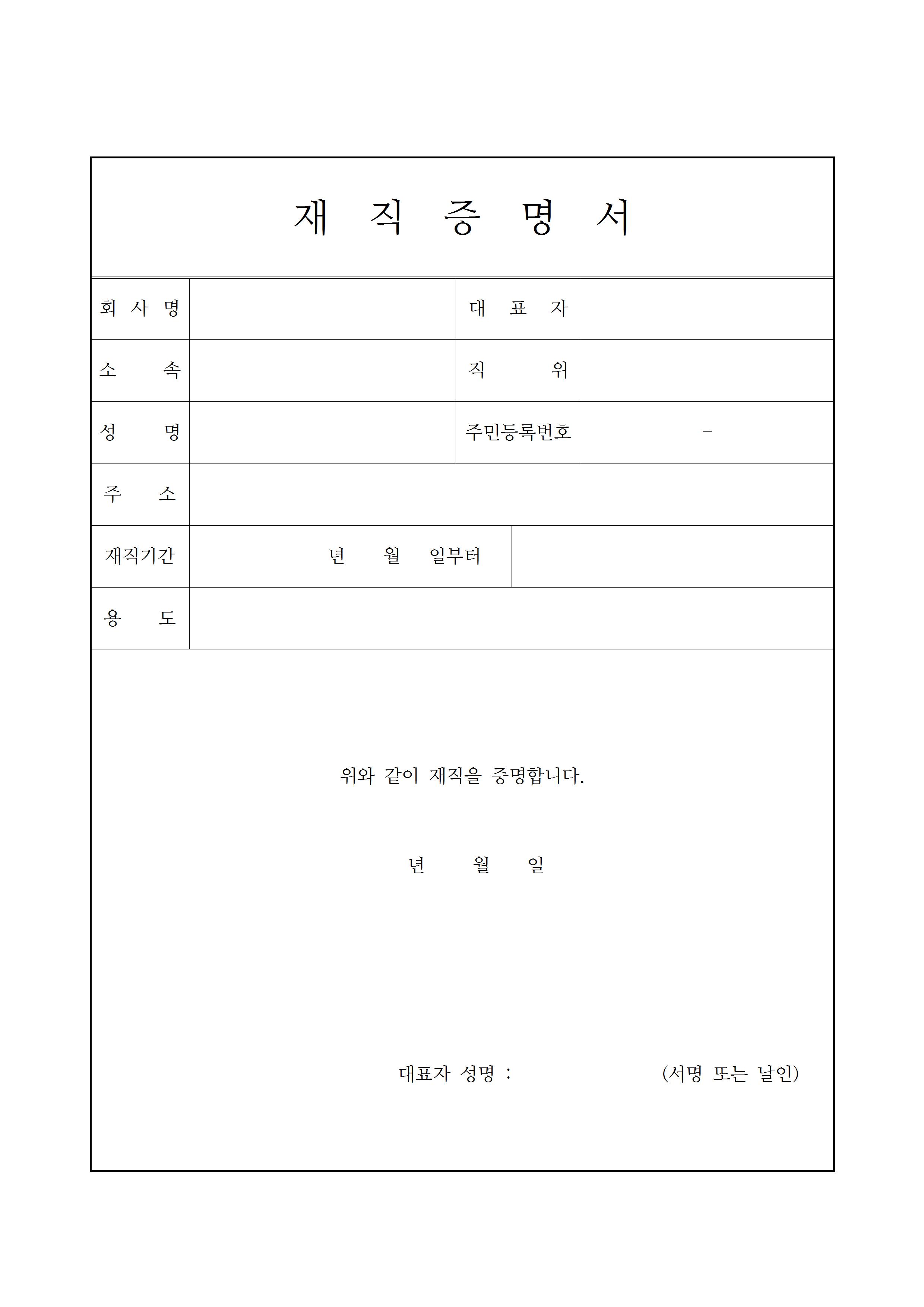 이번에는 한글과 한자 성명을 입력하는 칸과 주민등록번호, 주소 및 근무부서와 직위, 재직기간, 제출용도를 작성하는 재직 사항 및 제출 용도 칸이 있는 양식입니다. 그 밑에는 '위의 기재사항이 사실과 다름없음을 증명합니다'라고 적혀있어, 정확하게 증명을 한다는 확인 문구가 기재되어 있습니다. 밑에 회사명과 대표자, 사업자등록번호, 주소와 전화 등 회사에 대한 정보를 기재하는 칸이 하단에 위치해 있습니다.
