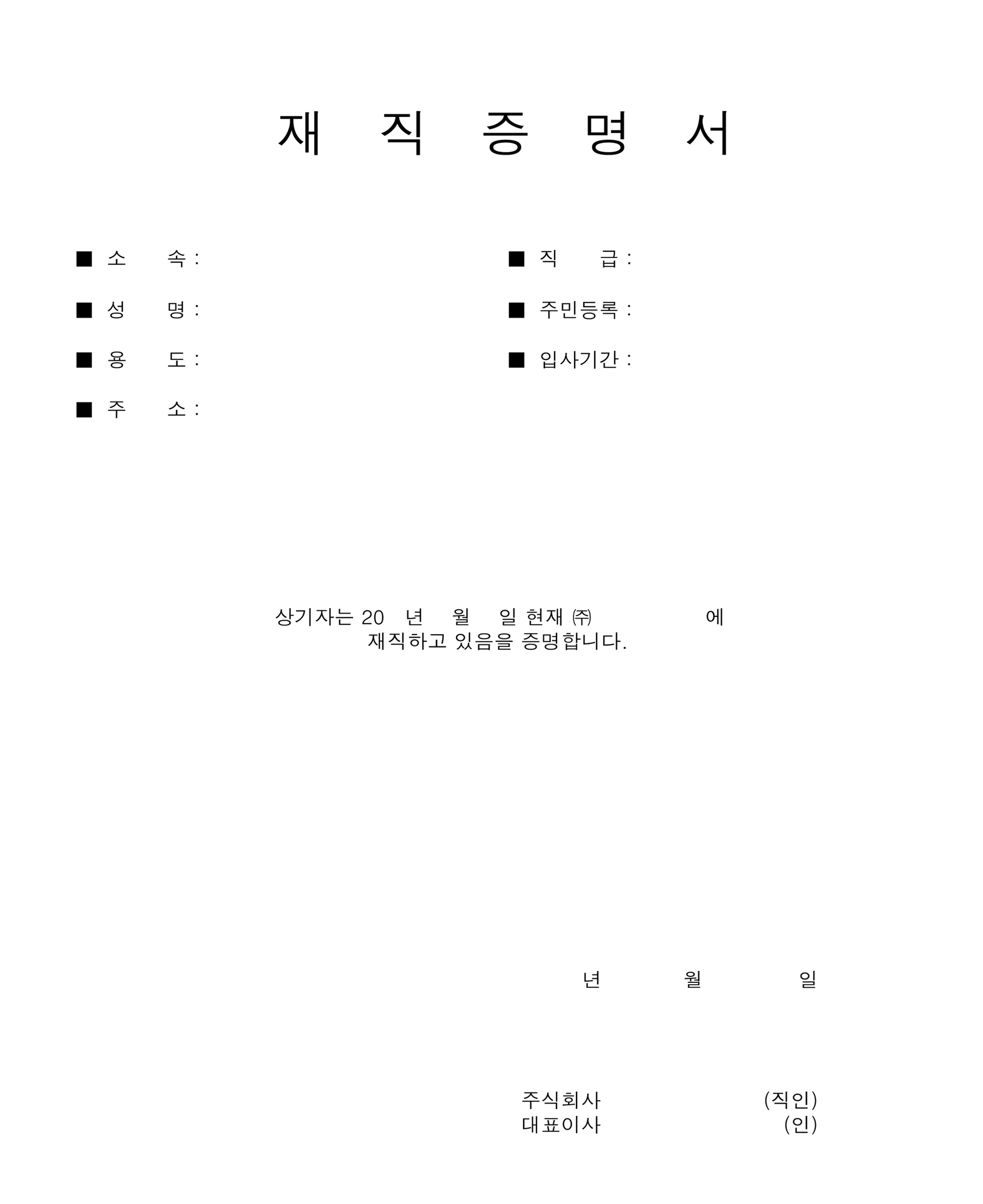 이번에는 기본 인적사항이 검은색 네모 박스로 각각 구성되어 있고요. '상기자는 2020년 00월 00일 현재 ~~에 재직하고 있음을 증명합니다.'라고 확인 문구가 기재가 되어있습니다.