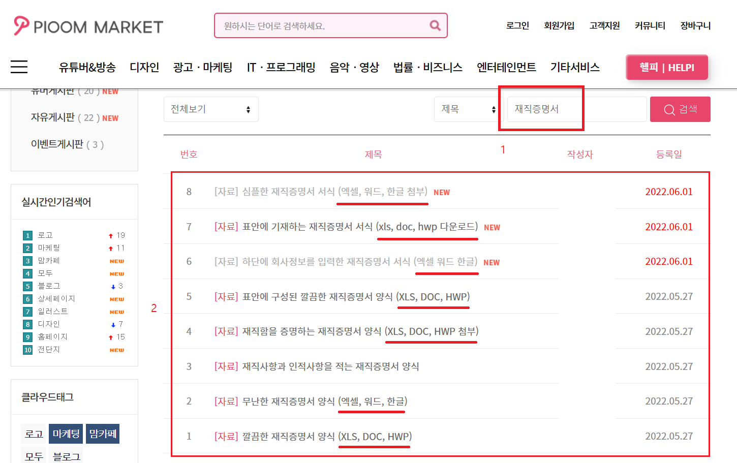 만약 오늘 만나볼 양식을 다른 확장자 명, 예를들면 엑셀 xls, 한글 hwp, 워드 doc 파일로 찾으신다면 위의 '피움마켓' 사이트 하단 '정보게시판'에서 재직증명서로 검색하셔서 무료 다운로드가 가능한데요. 1번과 같이 '재직증명서'라고 검색하신 다음 해당 마음에 드는 서식이 있는 게시물을 골라서 첨부된 파일중 내 컴퓨터에 설치되어 있는 확장자 문서를 무료 다운하시면 됩니다.