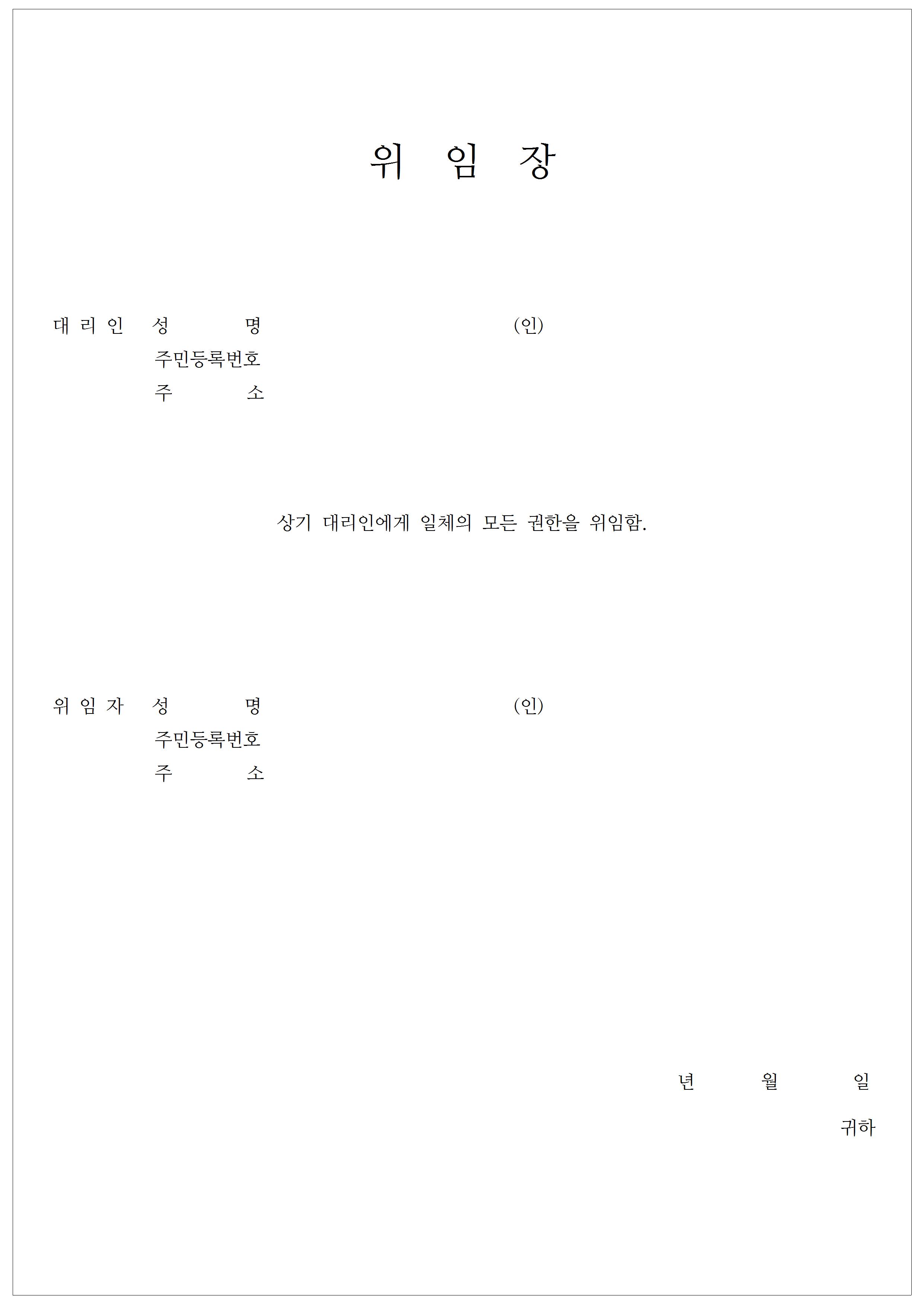 상황에 따라 내용이 조금씩 수정이 될 수도 있기 때문에 한글 hwp 원본 파일로 위임장 양식을 각각 첨부를 하였고요. 한글 파일이 없으신 경우에는 같이 첨부를 해드린 이미지를 저장하셔서 출력을 하신 뒤 수기로 작성 날인, 서명을 하시면 됩니다.