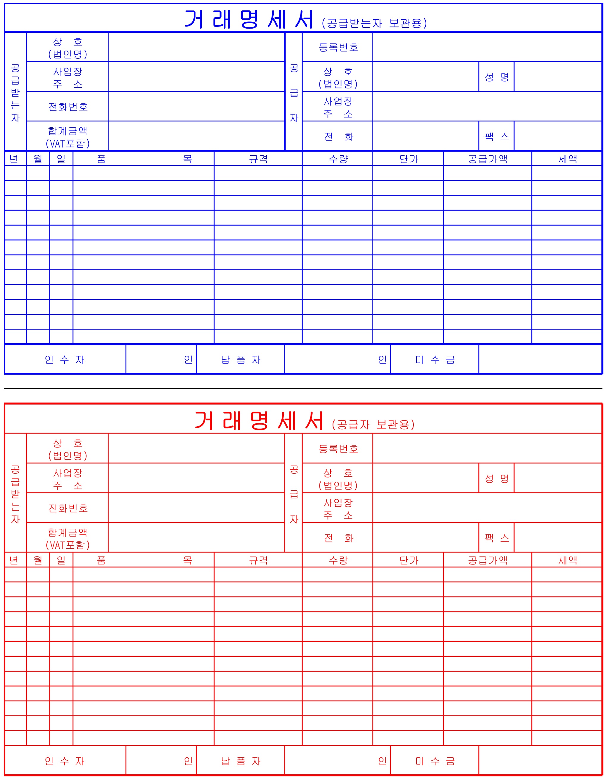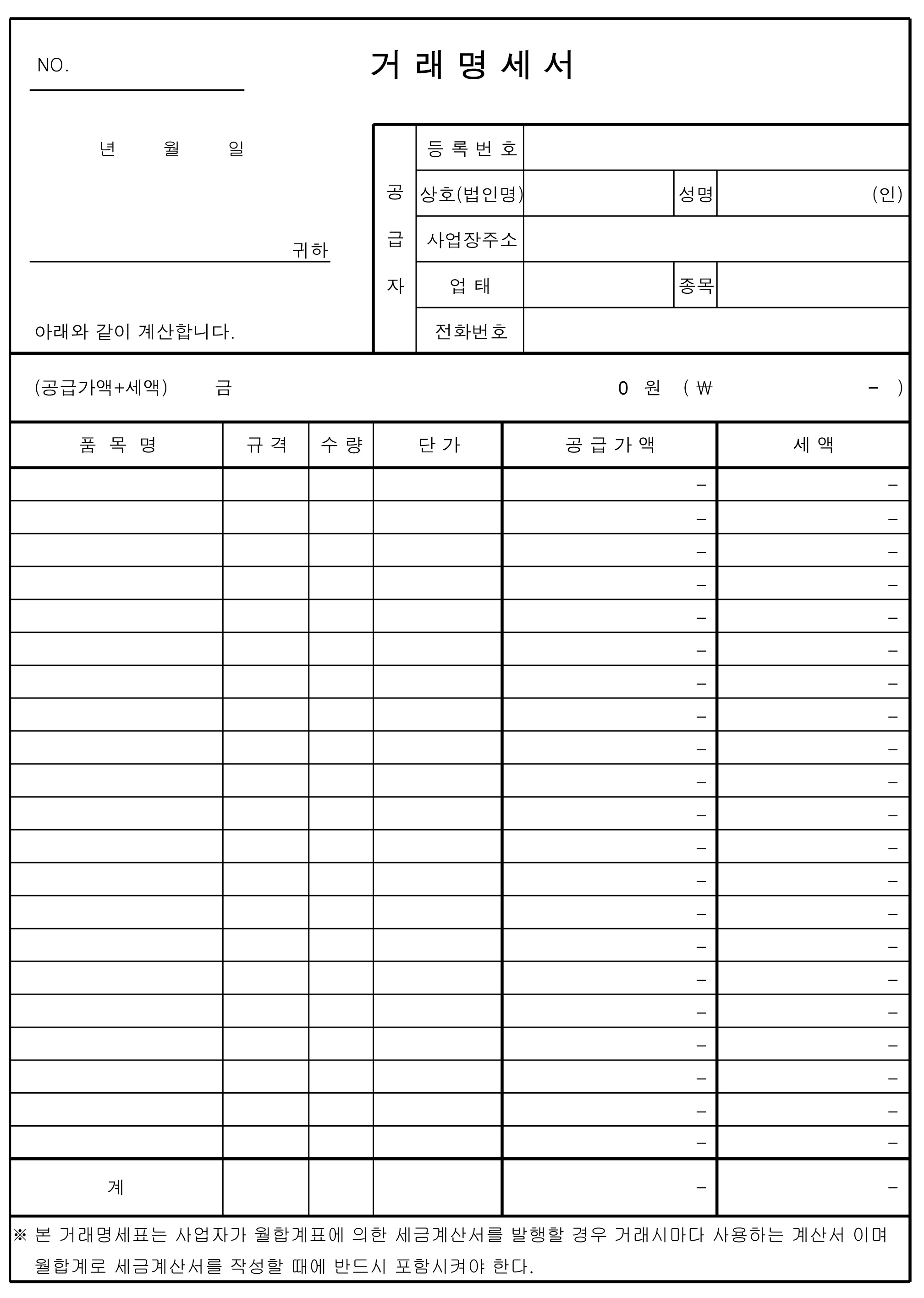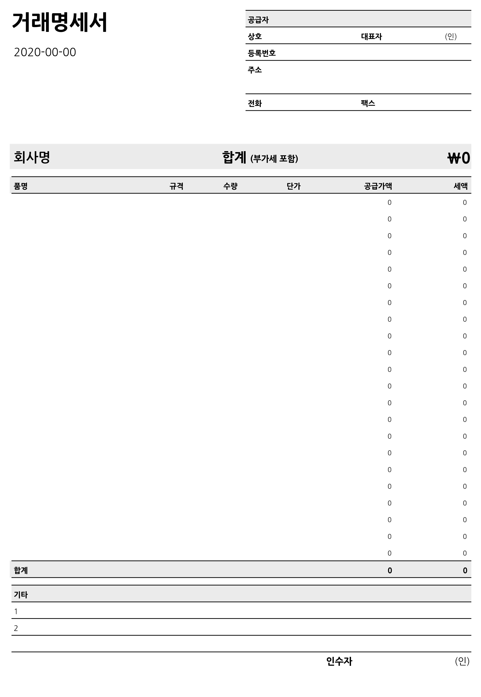마지막은 혹시 몰라서 앞전에 다루었던 거래명세표입니다. 다음 양식들에 이름을 견적서로 수정을 하셔서 사용하시는 것도 좋을 것 같아서 나열해봤습니다.