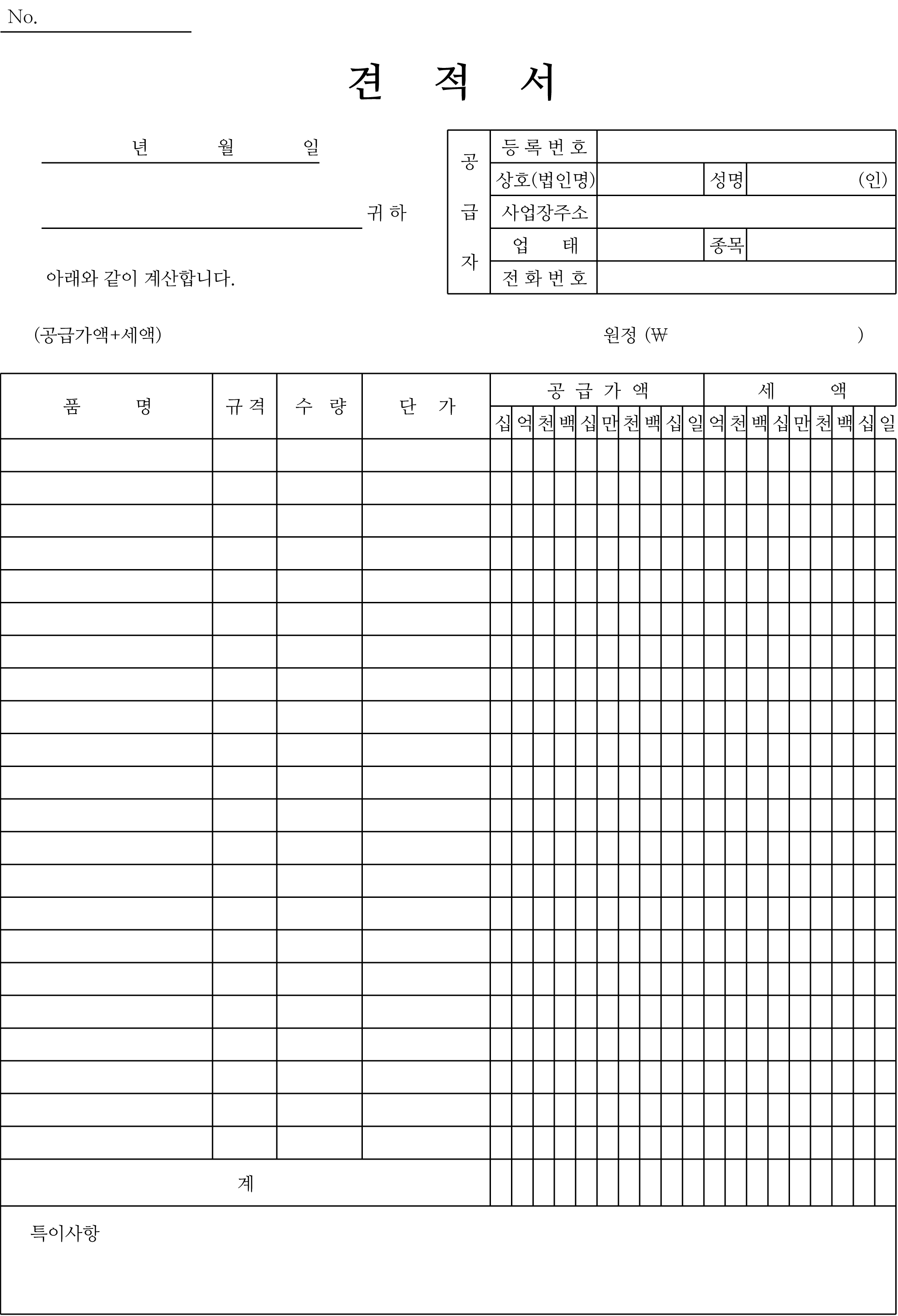 이런 양식도 필요하실 것 같아서 올렸습니다. 이것은 공급받는자와 공급자용을 같이 기재하는 수기 전용 견적서 양식입니다. 왼쪽에 공급받는자용에 수량과 단가를 입력하면 오른쪽에 자동으로 똑같이 입력이 되는 방식이고요. 수기로 직접 쓰면서 사용하는 경우에는 이미지만 저장하셔서 바로 프린트를 하시면 됩니다. 그러니까 정리하자면 점심에 따라 반으로 접어서 공급자와 공급받는자가 나눠가질 수 있는 양식이고요. 아니면 용지를 아끼기 위해서 한 장에 두 개씩 사용하시는 분들도 위의 견적서 양식을 활용하시면 좋습니다.