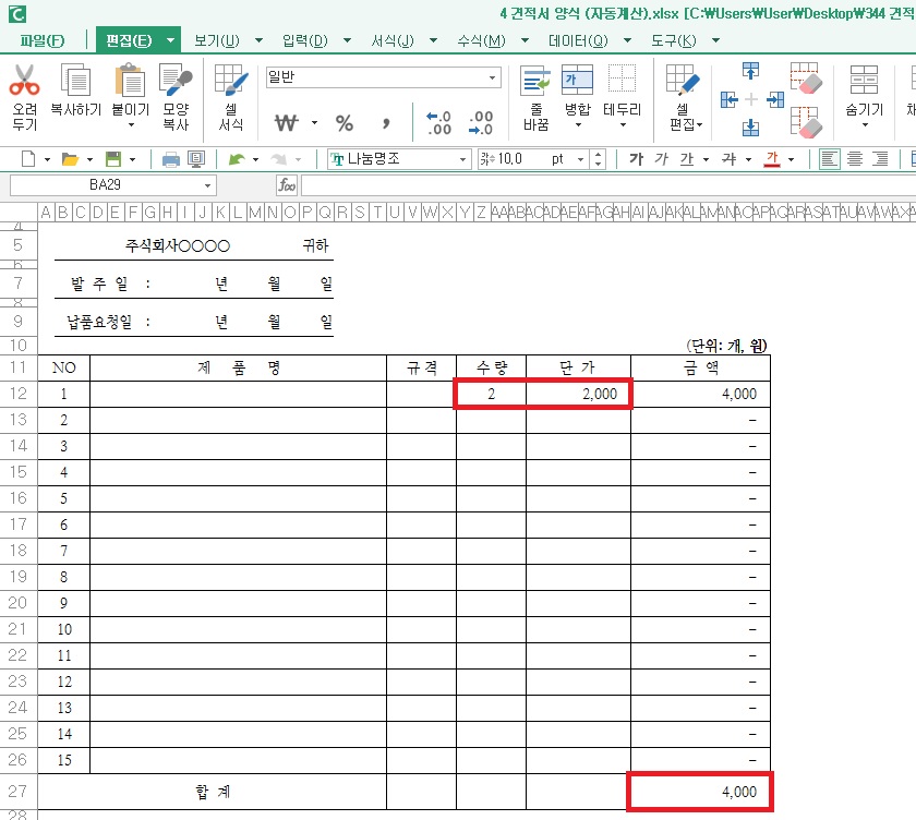 그래서 자동 계산이 필요하신 분들에게는 이런 양식이 조금 더 편할 것 같네요. 제일 하단에 문구는 삭제를 하셔도 됩니다.