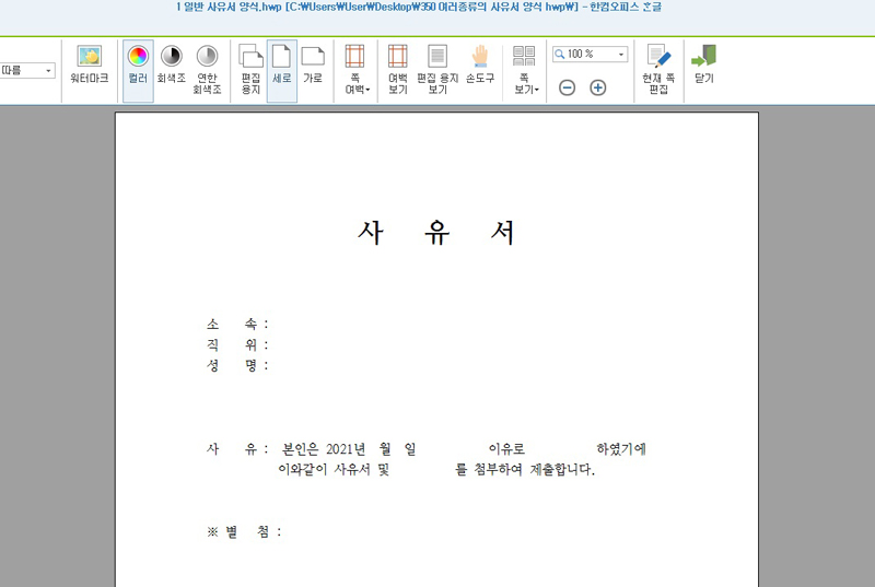 우선 아래에 각각 순서대로 첨부될 사유서 양식을 hwp 파일로 다운 후 원본을 열었을때 화면의 모습입니다. 간단하게 수정이나 편집이 용이하도록 다른 특별한 입력값 없이 텍스트 위주로 작성한 파일입니다.