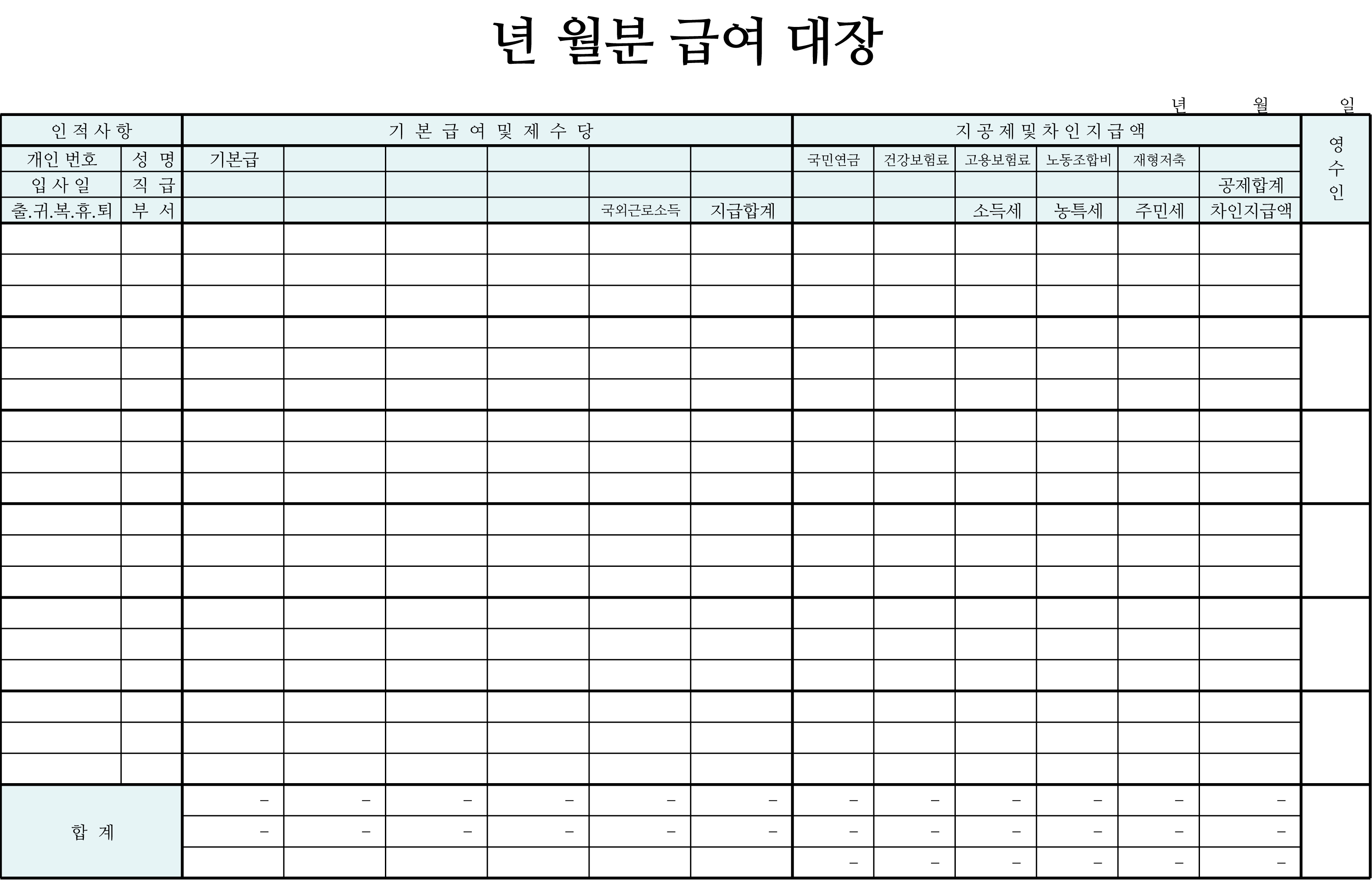 개인번호와 성명, 입사일과 직급, 출, 귀, 복, 휴, 퇴 등을 기록하는 인적사항 란과 기본급과 국외근로소득 등을 기재할 수 있는 기본급여 및 제수당 칸, 그리고 제일 오른쪽에는 여러 지급액을 작성하는 칸이 있습니다. 마찬가지로 각 칸에 지급 합계와 공제 합계가 자동으로 계산이 됩니다.