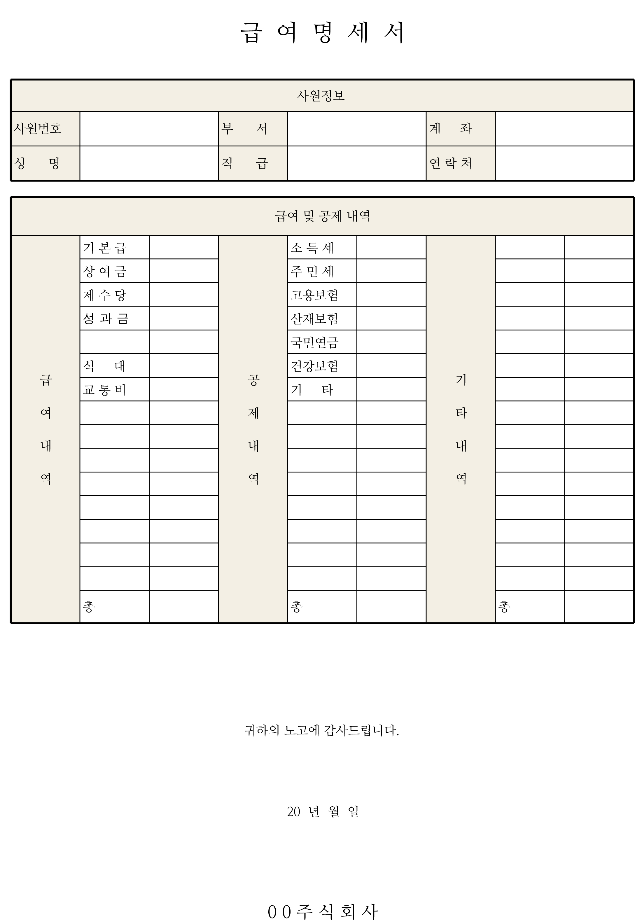 3번은 총 3개의 칸으로 구성이 되어있는 명세서입니다. 제일 상단에는 사원번호, 부서, 계좌, 성명, 직급, 연락처 등이 기재되어 있는 사원정보가 들어가 있으며, 마찬가지로 급여 및 공제 내역이 들어간 칸이 기타 내역까지 총 3칸으로 나뉘어서 작성할 수 있습니다. 하단에는 '귀하의 노고에 감사드립니다'라는 문구를 넣어봤으며, 날짜 그리고 사명이 들어간 란을 제일 밑에 넣었으니, 원본 파일을 저장을 한 다음 기업명이나 지급 항목들을 조금씩 수정하셔서 활용하시면 됩니다.