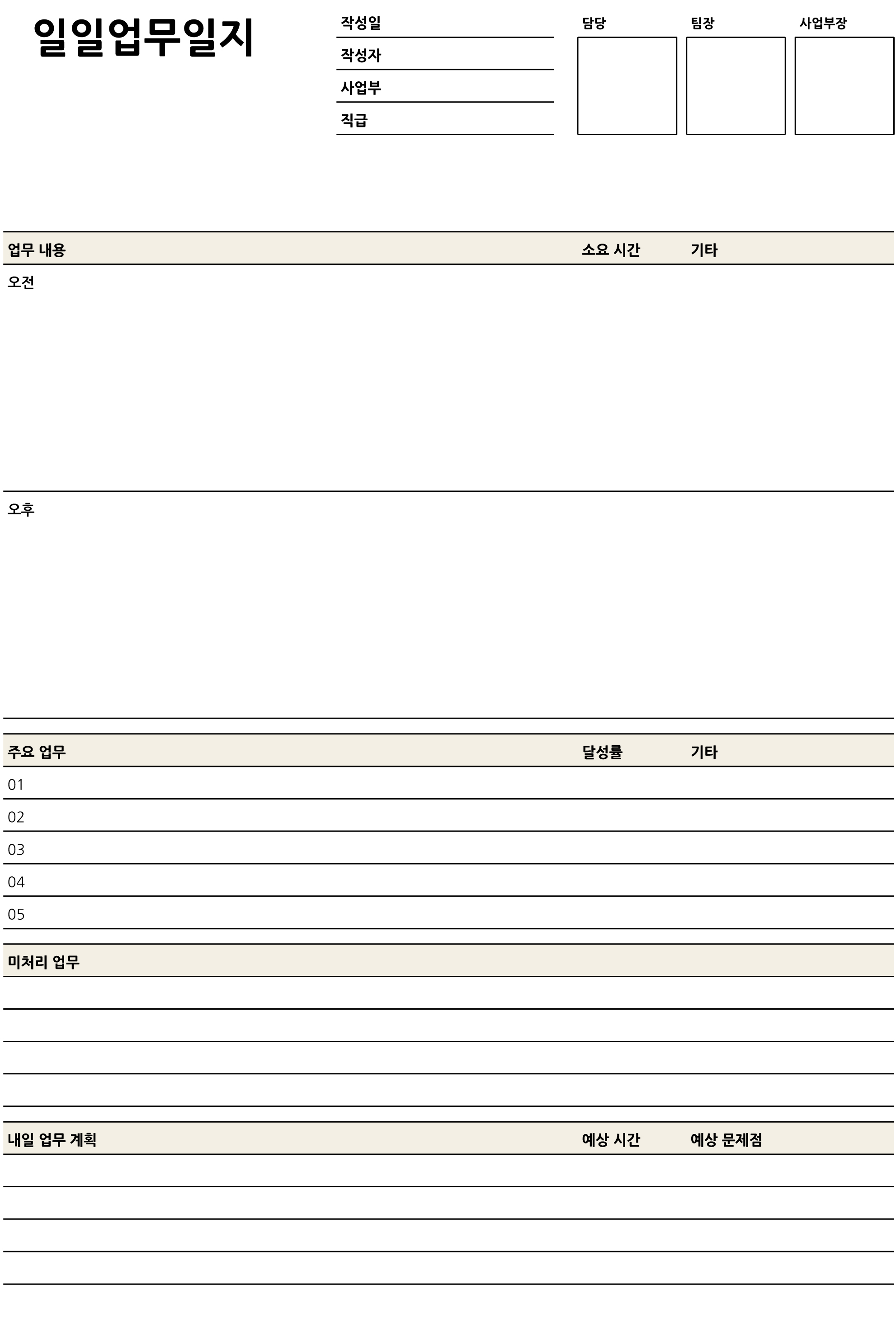 업무일지나 근무일지, 작업일지는 금일 또는 주간이나 월간 특정한 기간을 두고 실시할 업무 내용을 작성함과 동시에 진행이나 예정일 또는 해야할 계획이나 업무의 중요도와 흐름을 한눈에 보기 편하도록 관리하는 서식을 말하는데요. 자신이 근무하며 행했던 업무 또는 부가적인 계획이나 해야 할 일을 작성하는 것을 말하며 개인 프리랜서나 회사에서는 주 단위 또는 한 달 단위의 업무 보고를 하는 양식으로 많이 활용이 되고 있습니다. 업무 일지를 통해서 관리자나 담당자가 직무 분석이나 피드백이 가능하기 때문에 근무 시간 관리나 우선해야 할 것, 중요한 일 등 업무를 보다 효율성 있게 진행하는데 큰 도움이 됩니다.