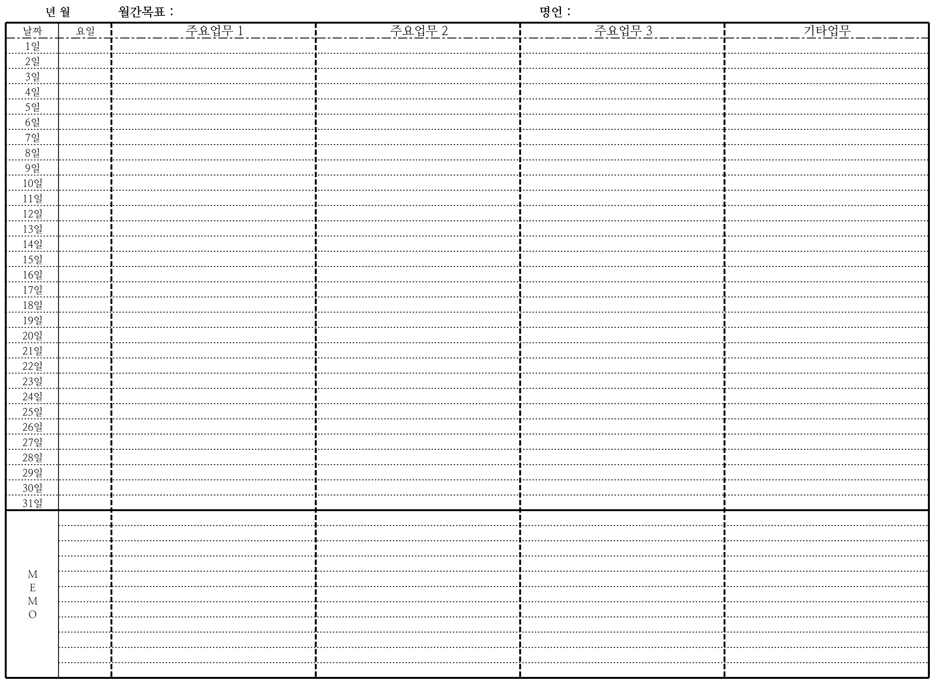 마찬가지로 날짜와 요일을 1일부터 31일까지 기록할 수 있는 양식입니다. 완료여부에는 완료가 되었을 때면 '완'자로 표기할 수 있으며 완료하지 못했을 시에는 공백으로 두거나 '미'라고 작성하시면 됩니다. 특이사항이 있기 때문에 문제점이나 완료하지 못한 사유 등을 간단하게 기록하거나 주요 업무 2로 셀을 병합하여 수정하셔서 활용하셔도 좋습니다.