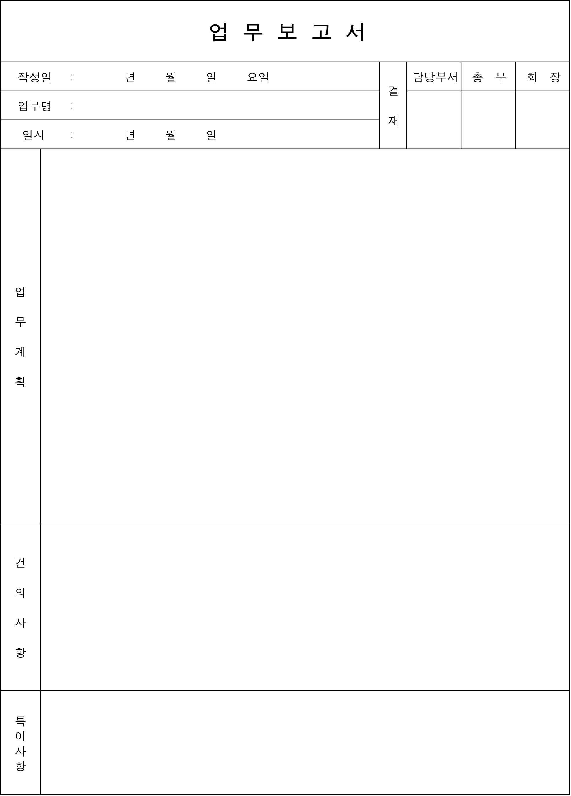 다음은 업무에 관한 상세한 내용을 기재하는 업무보고서 양식입니다. 전반적인 업무 내용이나 계획 등을 작성하고 추가적인 건의사항이나 특이사항을 작성할 수 있습니다.
