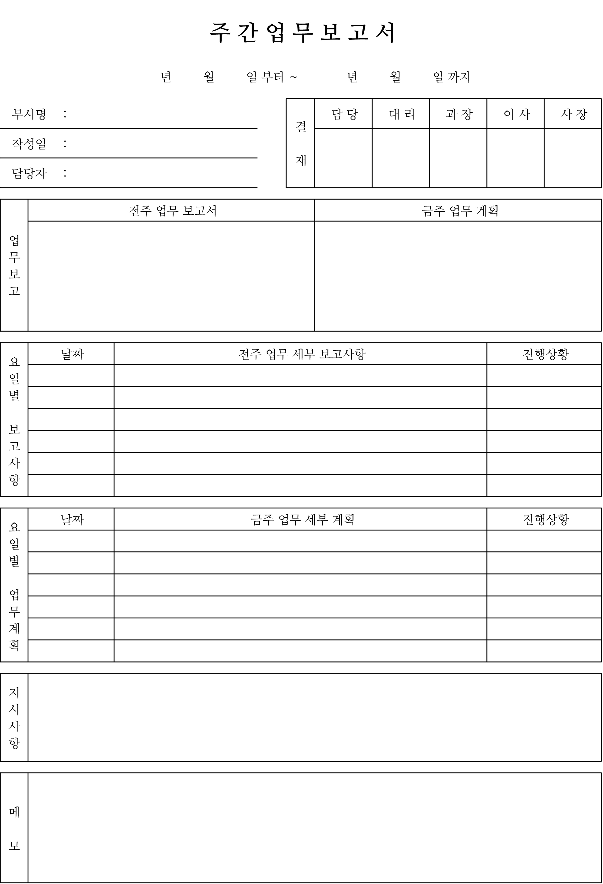 다음은 주간 단위로 작성하는 주간업무보고서 양식입니다. 아까 처음에 봤던 1번 보고서와 양식이 조금 비슷하기는 하지만 서식 안에 문구를 주간 단위로 보고할 때 적합한 문구들을 넣었습니다. 요일별 보고사항과 요일별 업무계획을 구체적으로 작성할 수 있는 양식이며, 마찬가지로 지시사항이나 메모를 기록할 수 있습니다.