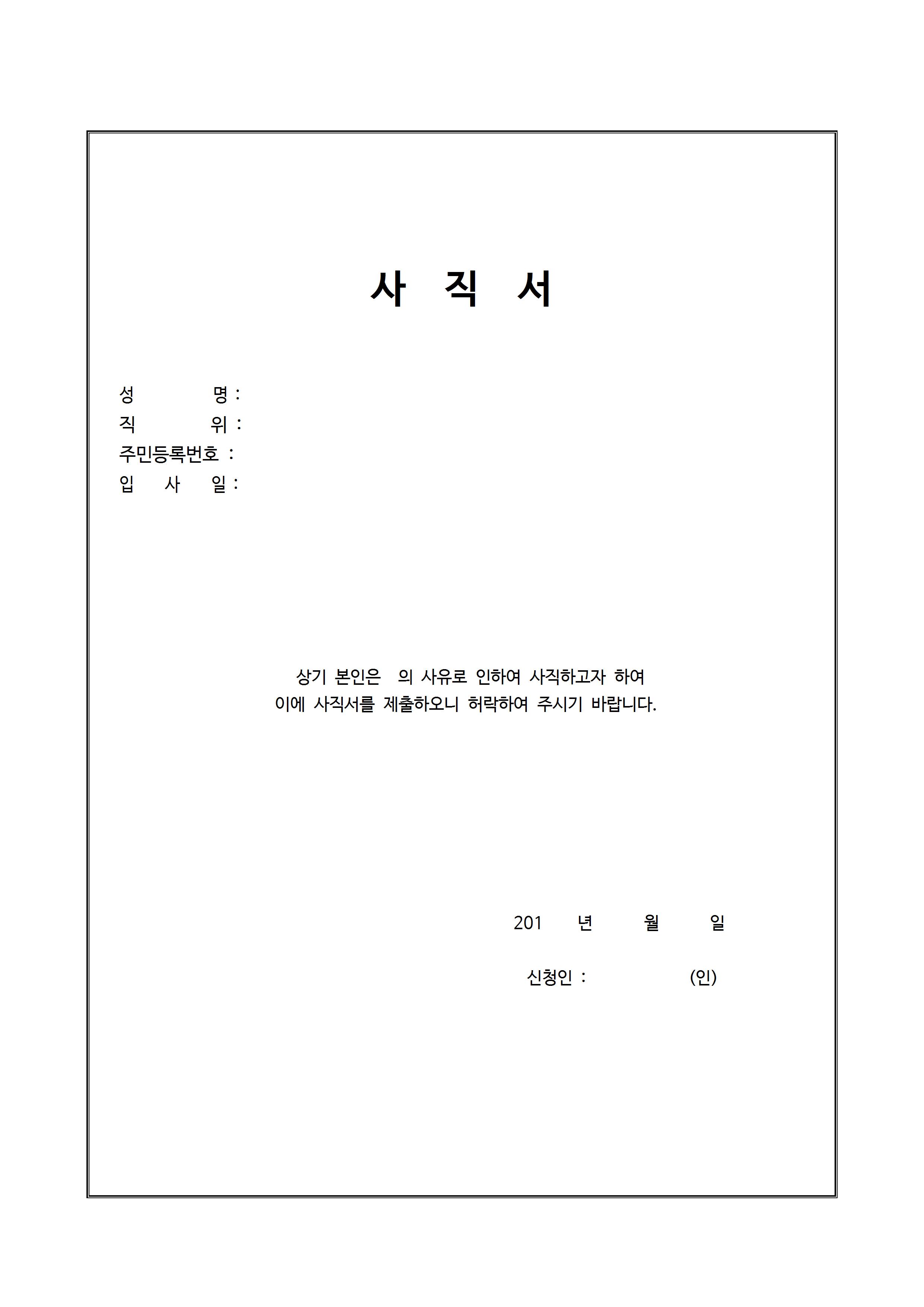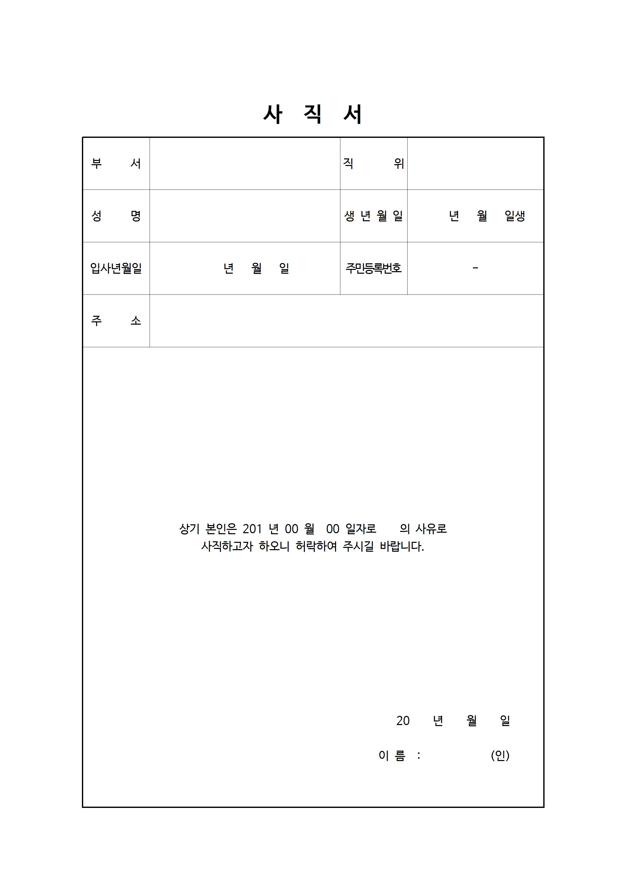 다음은 부서와 직위, 성명과 생년월일, 입사년월일, 주민등록번호와 주소의 기본적인 인적사항을 테두리가 있는 표 안에 작성하는 깔끔한 사직서 양식입니다. 표 안에 모든 내용들이 다 들어가 있기 때문에 시야가 분산이 되지 않고 깔끔한 느낌을 전해주는 서식입니다.