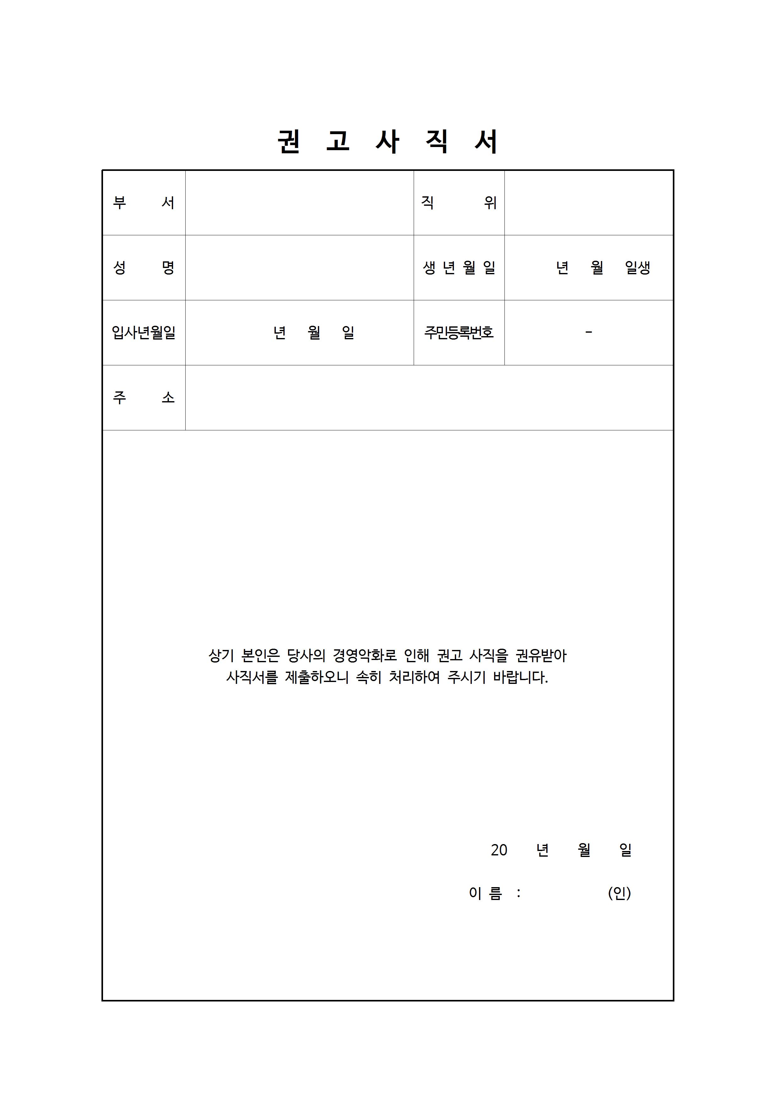 이렇게 다양한 사직서 양식 다운과 권고사직서 양식까지 여러 가지 모음으로 살펴봤는데요. 업장에 따라서 일반적으로 사직서를 제출을 하지 않고 구두 상으로 퇴직 의사를 밝혀 바로 퇴사를 하는 경우도 있지만 이런 경우에는 근무 기간이 짧거나 근무자의 공백으로 인하여 크게 무리 없이 대체할 수 있는 상황이기 때문일 수 있지만 이런 사직서를 제출하고 담당자에게 퇴직 의사를 전하는 것이 예의에 어긋나지 않는 가장 정석적인 퇴사 요령이 아닐까 싶네요.