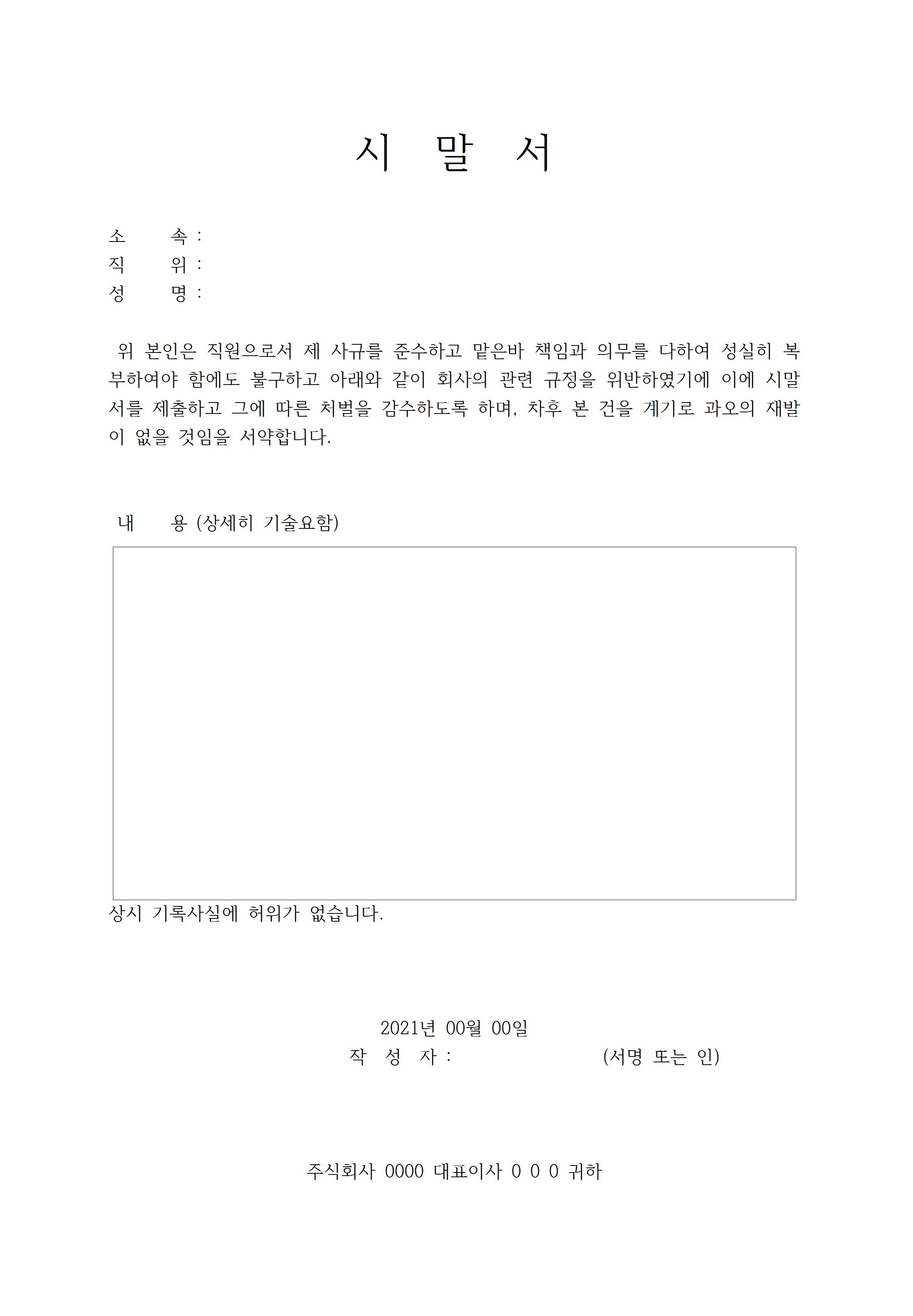 시말서 양식 hwp 무료 다운로드 무료 다운로드가 가능한 시말서 양식을 한글 hwp 파일로 첨부를 했습니다. 여러 예시와 총 6가지의 서식을 통해 작성요령 또는 쓰는 법에 많은 도움이 되었으면