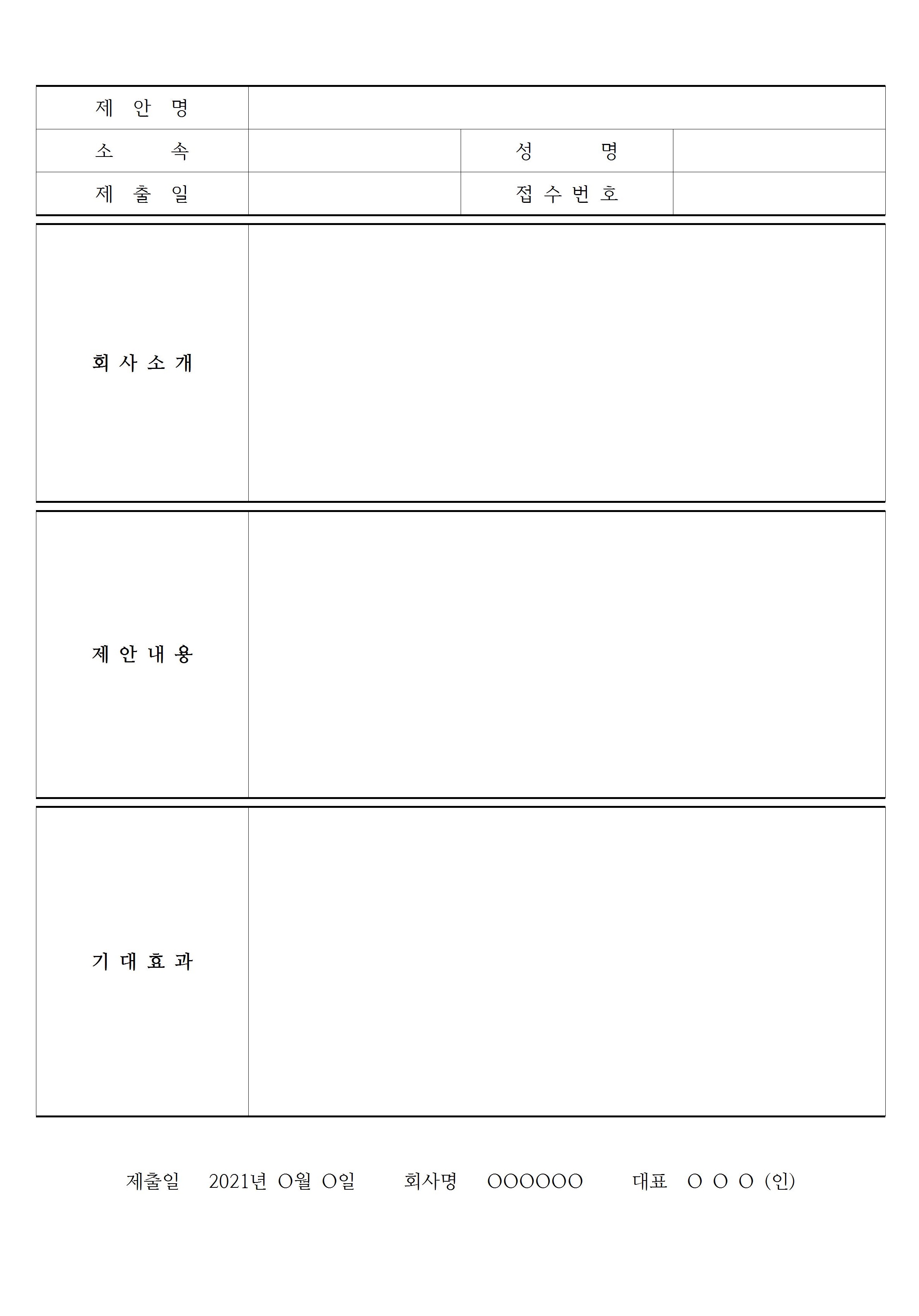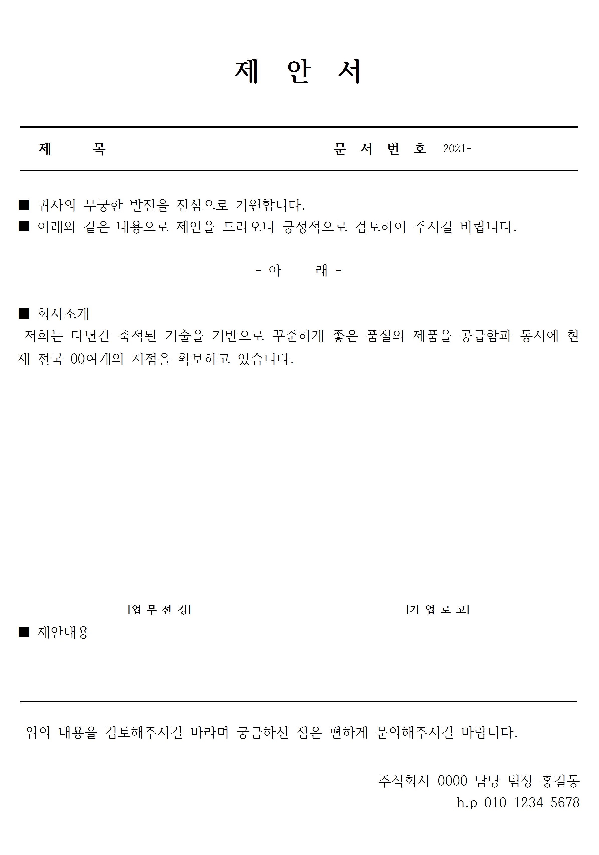다음은 앞전에 다루게 되었던 기타 재안서입니다. 위의 원본 파일을 저장하고자 한다면 조금 번거로우시겠지만 다음에서 '한눈에 들어오는 사업제안서 양식' 편을 검색하시거나 바로 이전 글을 누르시면 해당 글을 바로 열람하실 수가 있습니다. 이렇게 다양한 서식으로 구성을 해본 공문 양식 모음이었습니다. 여러분들에게 도움이 될 수 있는 시간이 되었길 바랍니다.