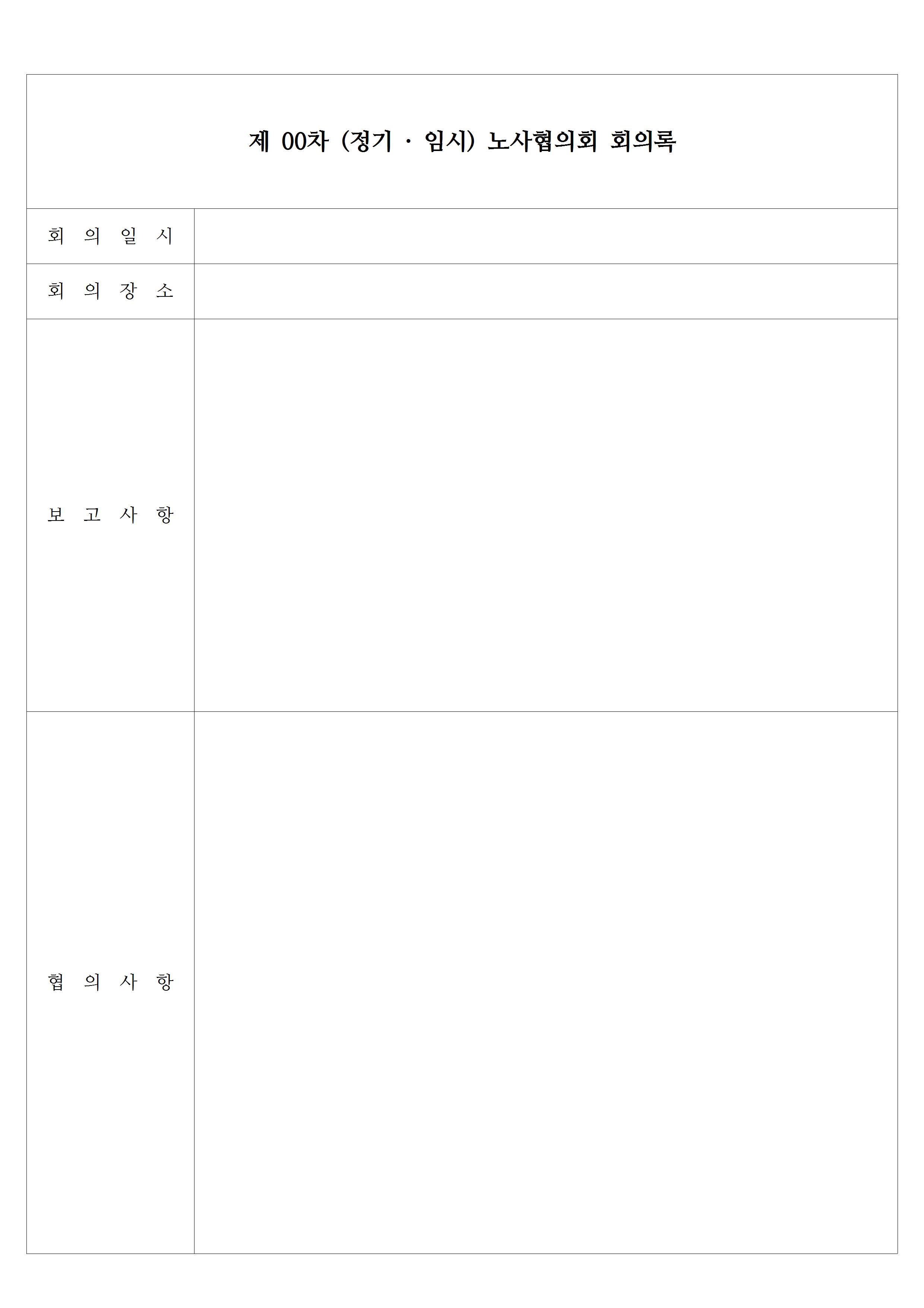 다음은 노사와 기업 간에 작성하는 노사협의회 회의록 양식입니다. 보고사항이나 협의사항 등을 간결하고 심플한 서식으로 구성이 되어 있으며, 참석자 인원 서명 란은 별지에 해당이 되는 두 번째 페이지에 기재할 수 있습니다. 따라서 노사협의회는 총 2장으로 이루어진 한글 hwp 파일이고요.