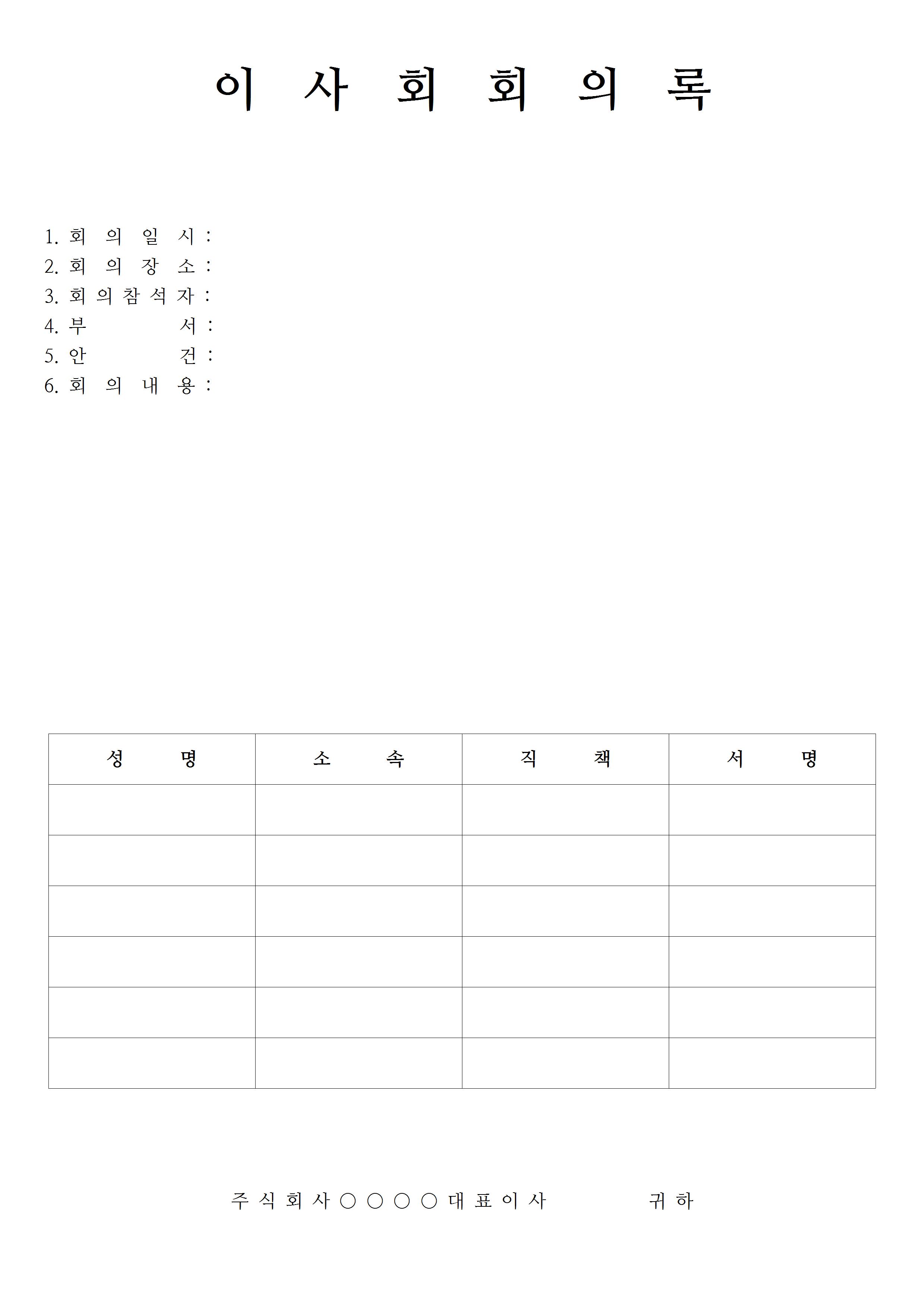다음은 기업이나 중소기업에서 많이 활용되는 이사회 회의록 양식입니다. 디자인보다는 간단하고 심플한 서식으로 되어 있기 때문에 상부에서 검토를 하더라도 크게 거부감없이 깔끔하게 볼 수 있는 서식입니다. 구성은 회의 일시, 회의장소, 회의 참석자, 부서, 안건, 회의 내용을 입력하는 칸과 성명과 소속 직책과 서명을 할 수 있는 표가 하단에 배치해 있습니다.