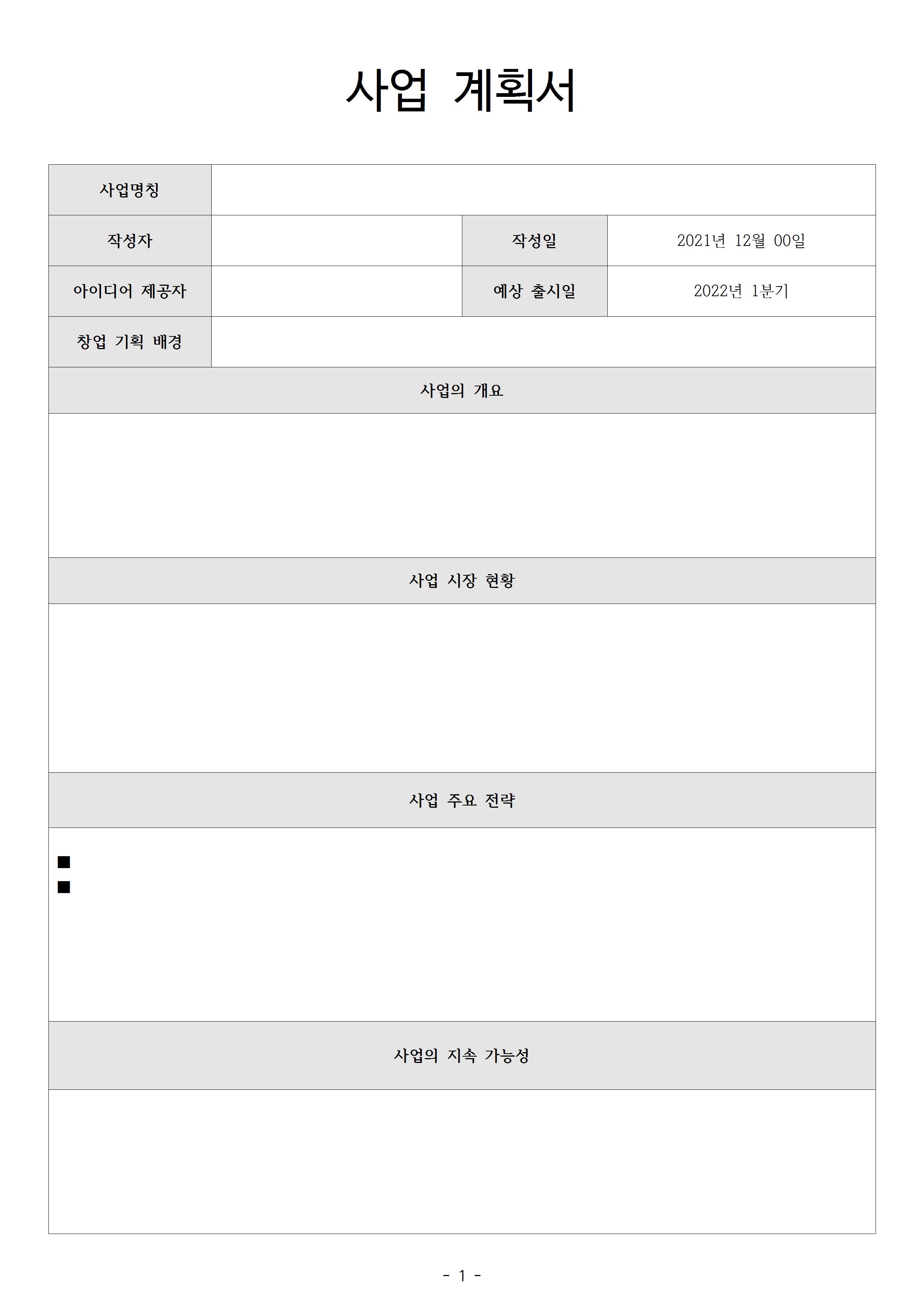 다음은 내가 개인적인 용도로 그냥 머릿속에 구상하고 있는 것을 구체화하기 위한 목적으로 깔끔하고 단순하게 작성할 수 있는 사업계획서 양식입니다. 사업의 주요 개요와 사업 명칭, 시장현황고 목표 수요층, 사업(비즈니스) 모델 등을 작성할 수 있습니다.